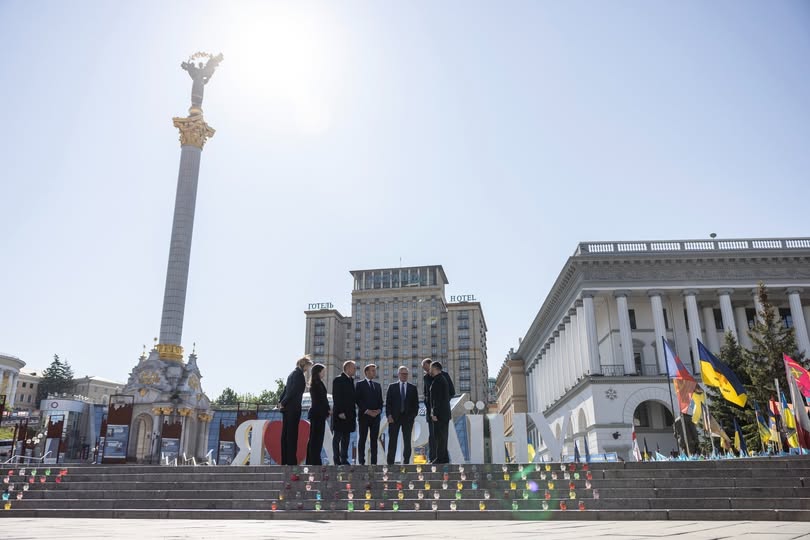 (Foto: Keir Starmer, Emmanuel Macron , Friedrich Merz e Donald Tusk a Kiev durante le celebrazioni dell'80° anniversario della vittoria sul nazismo)