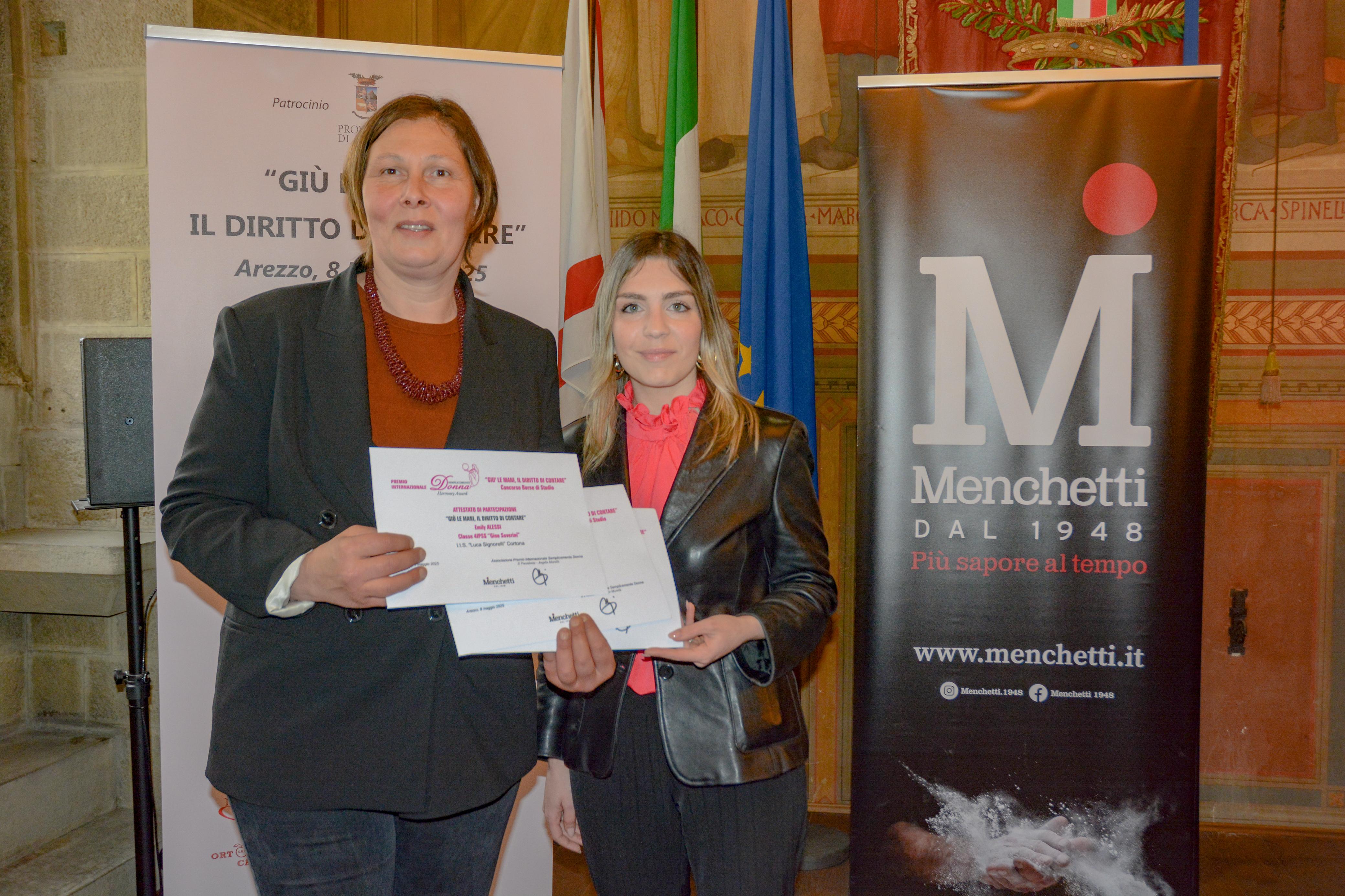 Si è svolta questa mattina, giovedì 8 maggio, in una Sala dei Grandi della Provincia di Arezzo gremita e piena di entusiasmo come non mai, la cerimonia di consegna delle borse di studio “Giù le mani. Il diritto di contare”, momento conclusivo del progetto scuole legato alla XII edizione del Premio Internazionale Semplicemente Donna.