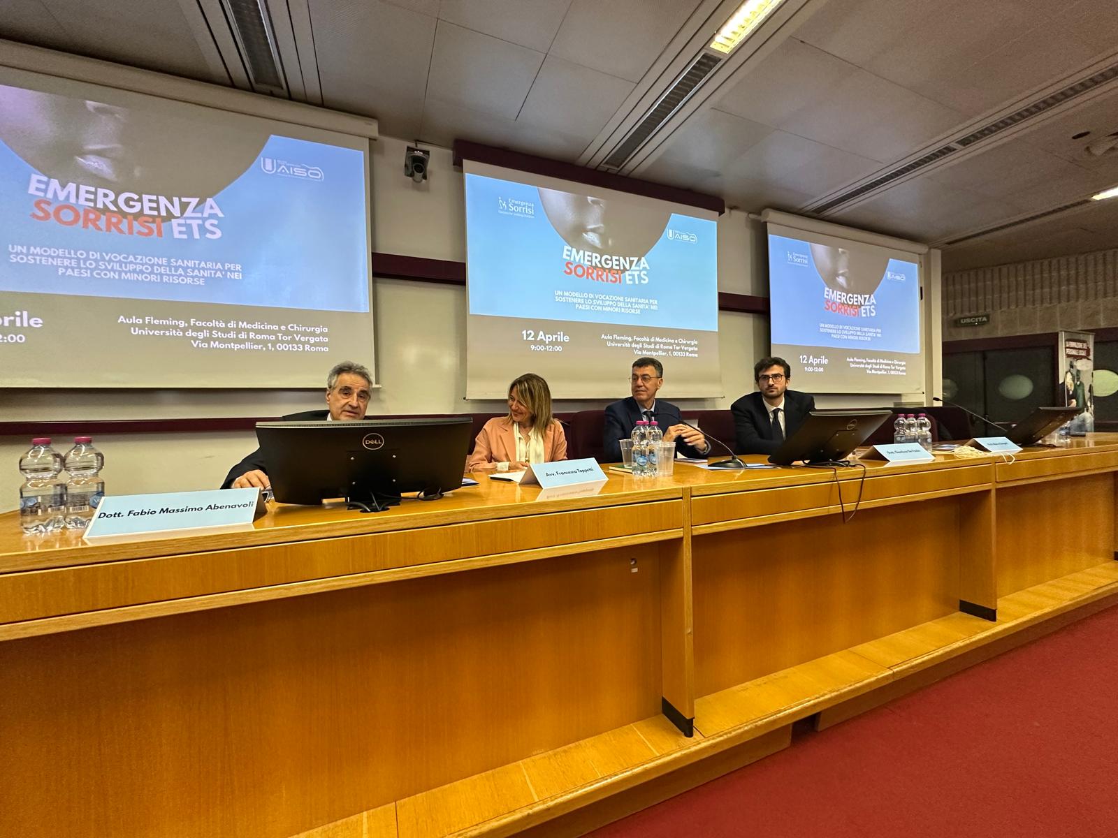 L’Avvocato Toppetti, accanto al Presidente di Emergenza Sorrisi, Dott. Fabio Abenavoli, hanno illustrato ai presenti la storia di Emergenza Sorrisi e il valore della cooperazione internazionale legata alle missioni nel mondo dell’associazione. L’incontro è stato moderato da Lorenzo Maria Laudiero, presidente di AISO Tor Vergata, ed è stato aperto dai saluti istituzionali del Magnifico Rettore, Nathan Levialdi Ghiron, che non era presente all’evento. In sua vece c’era il Preside della Facoltà di Medicina, Prof. Stefano Marini.