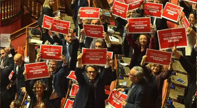 La conclusione delle dichiarazioni di voto è stata movimentata dalle opposizioni, che hanno esposto in aula alcuni cartelli rossi per indicare le promesse mancate dal governo: “Promettevano abolizione accise, aumentano tasse sul carburante. Voltafaccia Meloni”; “Promettevano abolizione Fornero, aumentano l’età pensionabile. Voltafaccia Meloni”; “Promettevano investimenti in sanità, tagliano le risorse. Voltafaccia Meloni”; “Promettevano diminuzione tasse, è record pressione fiscale. Voltafaccia Meloni”.