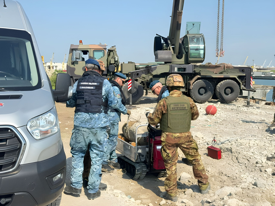 Artificieri dell'8° Reggimento Guastatori Paracadutisti e i palombari del Comando Subacquei ed Incursori della Marina Militare neutralizzano un ordigno da 227 kg lanciato da aerei alleati nel corso dell'ultimo conflitto