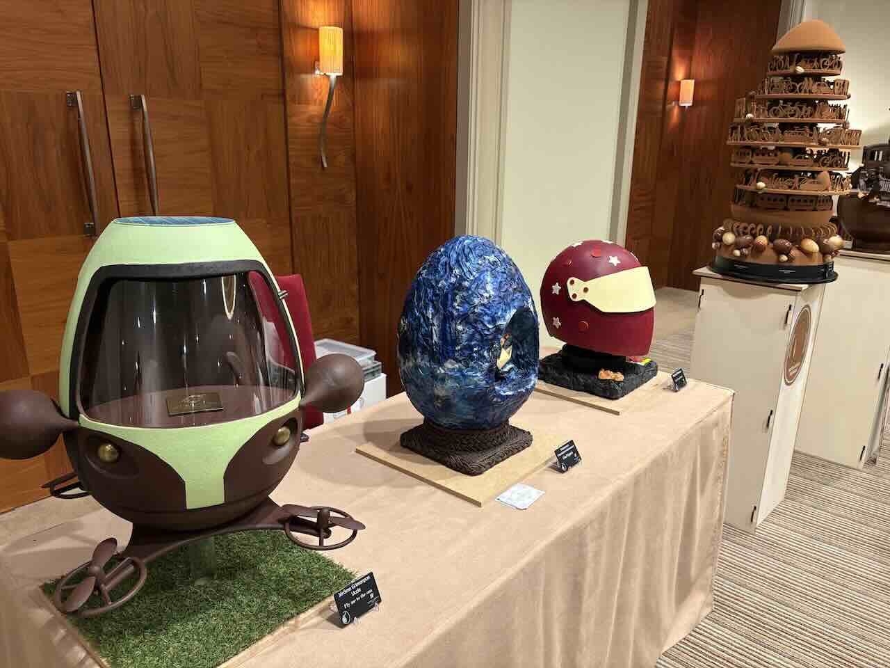Tra le sculture esposte figurano treni, razzi, biciclette, mongolfiere e motociclette, tutte realizzate con miscele di cioccolato fondente, bianco o al latte, arricchite da praline e glasse colorate. La meccanica del movimento è diventata così il filo conduttore di questa insolita galleria gastronomica.