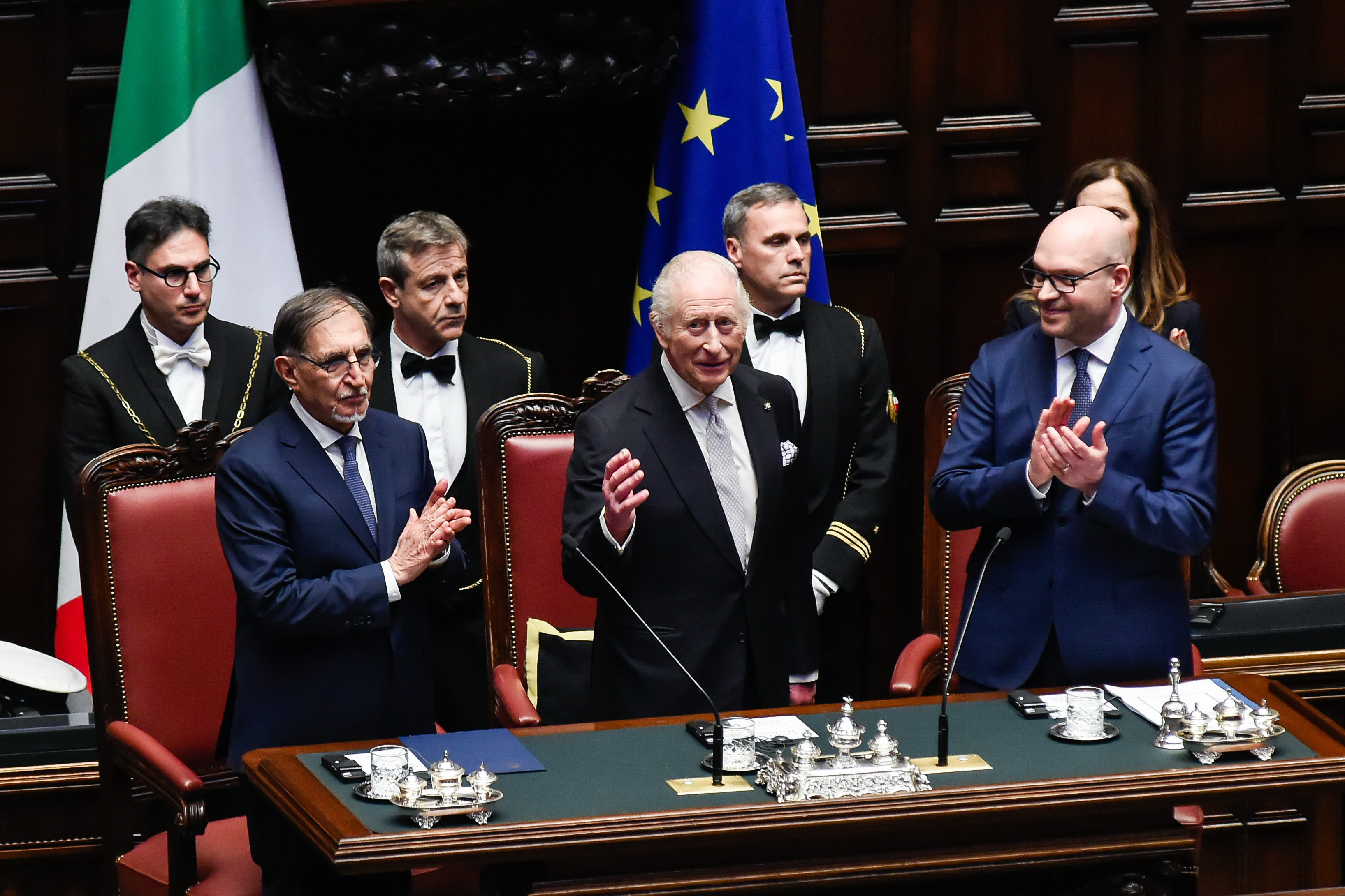 "Gran Bretagna e Italia sono unite nella difesa dei valori democratici. I nostri Paesi sono stati tutti e due al fianco dell'Ucraina nel momento del bisogno, le nostre forze armate sono fianco a fianco nella Nato. Siamo infinitamente grati del ruolo dell'Italia che ospita basi chiave della Nato e che guida numerose operazioni all'estero", ha detto ancora il Sovrano inglese.