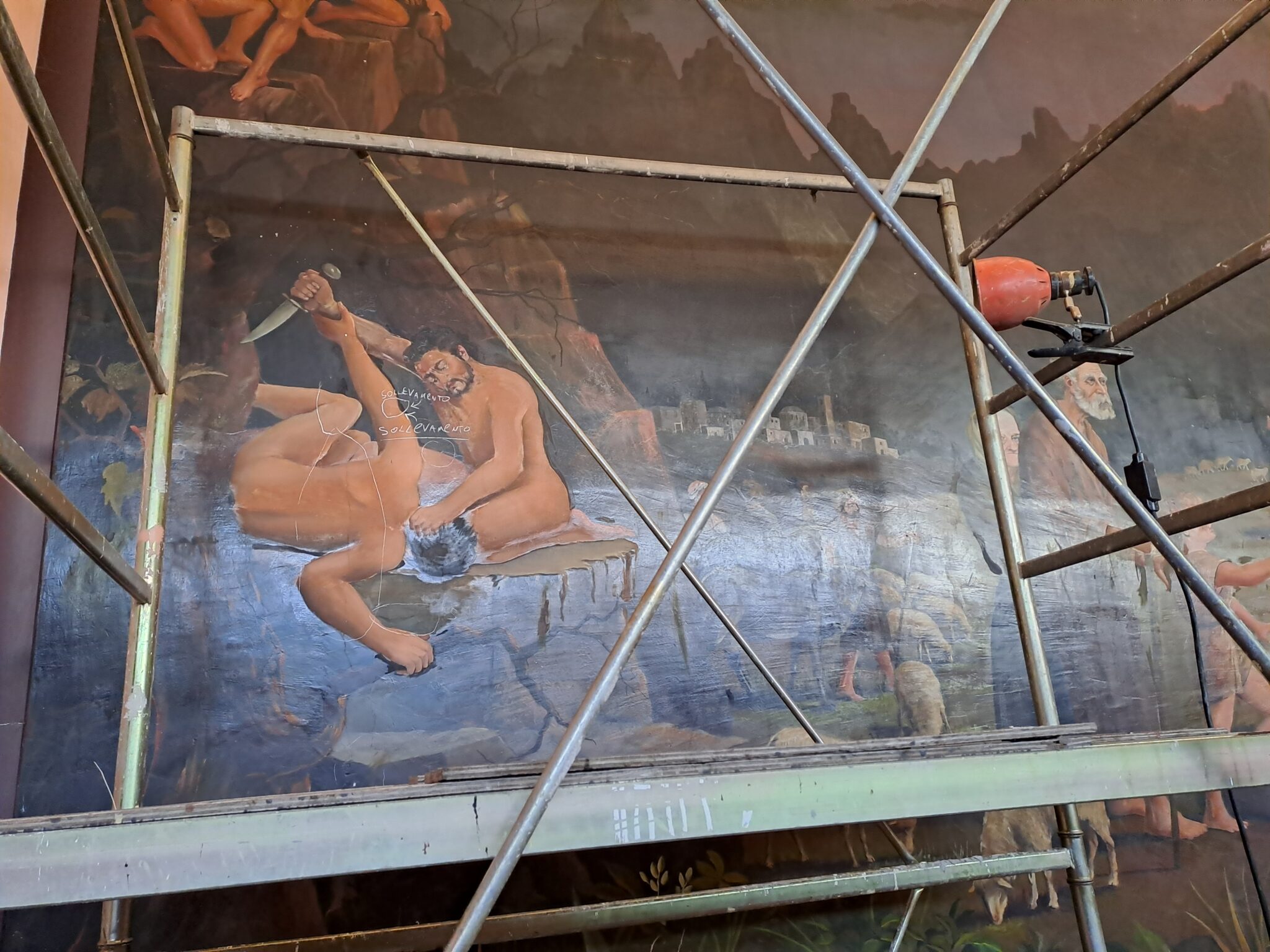 All’interno di questo scenario architettonico d’eccezione, l’affresco monumentale “Storia della Salvezza” – realizzato a olio su muro dall’artista Ugo Bernetti Da Vila nel 1981 – è tornato a nuova vita grazie a un importante intervento conservativo svolto da gennaio ad aprile 2025.