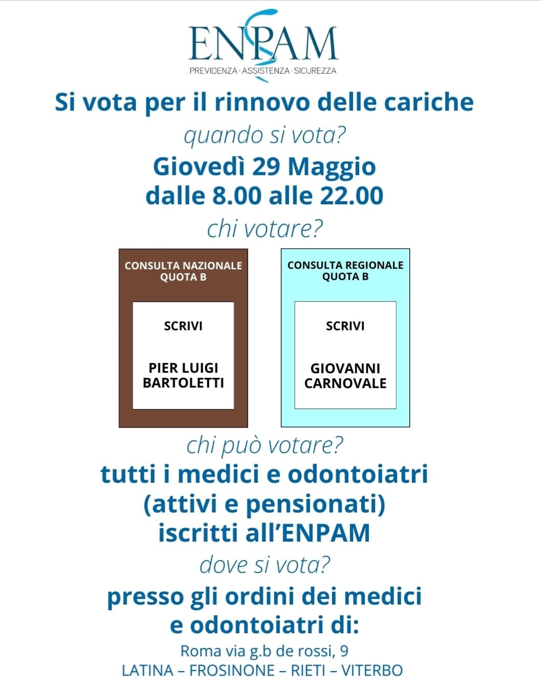 Hanno diritto al voto tutti i medici e odontoiatri, sia attivi che pensionati, iscritti all’ENPAM. La votazione si svolgerà presso gli Ordini dei Medici e degli Odontoiatri delle seguenti province: Roma (via G.B. de Rossi, 9), Latina, Frosinone, Rieti e Viterbo.