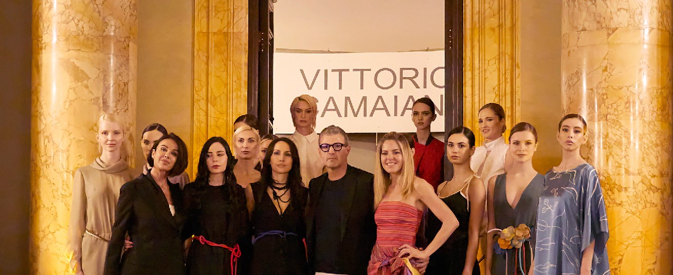 Con la nuova collezione Vittorio Camaiani presenta creazioni che rispecchiano le atmosfere delle diverse culture del mondo che, attraverso la sua moda, il suo estro e la sua eleganza, come una sorta un fil rouge, vorrebbe rendere unito in questo difficile momento storico dominato da conflitti e disparità, raccontandone le diverse identità dei popoli sognando di “unire il mondo con il tessuto”.