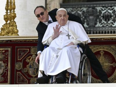 Nel corso della visita, in cui ha incontrato una settantina di fedeli che l'hanno salutato con un'ovazione, il Santo Padre è apparso in sedia a rotelle, ma senza naselli per l'ossigeno.