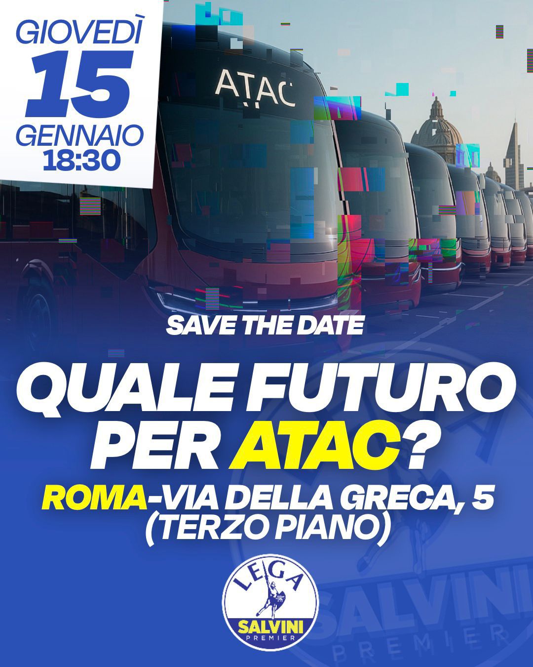 Ecco perché giovedì 15 gennaio alle ore 1830, la Lega, promuove un incontro dal titolo: ‘Quale Futuro per Atac?’ per dare voce ai lavoratori, ai sindacati, ai cittadini, e tracciare una nuova rotta di responsabilità, efficienza e dignità per il Tpl”.