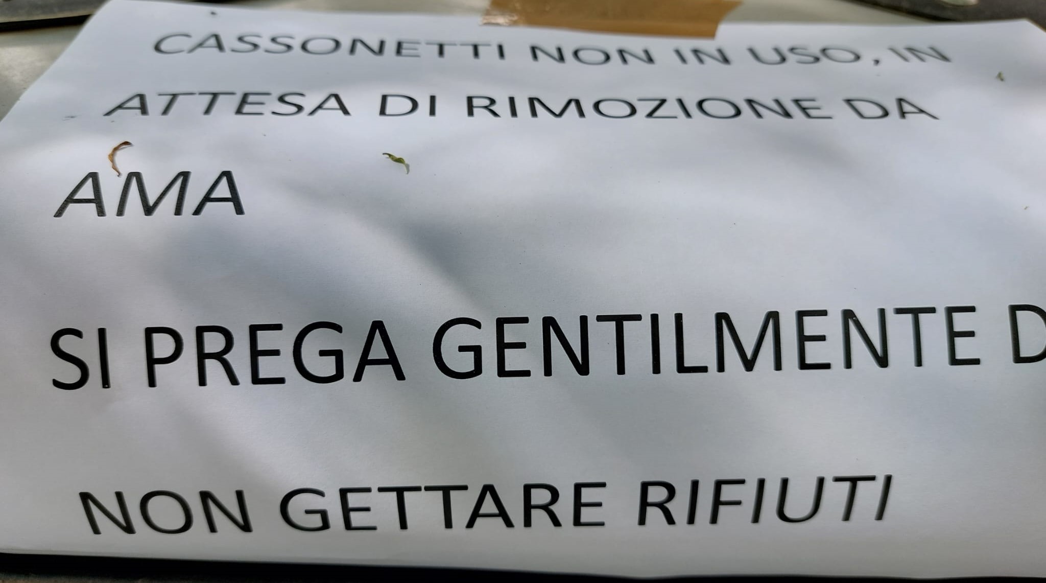 “Cassonetti non in uso, in attesa di rimozione da parte di AMA. Si prega gentilmente di non gettare i rifiuti.”