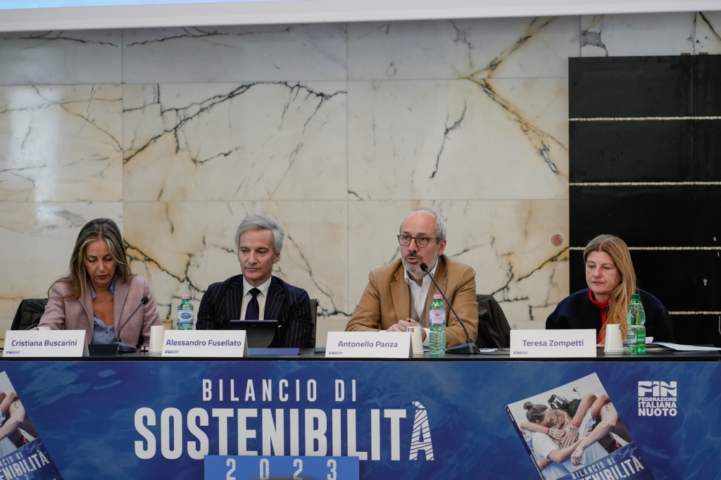Nella Sala Convegni il vice presidente della Federazione Italiana Nuoto Andrea Pieri, il segretario generale Antonello Panza, la responsabile del Laboratorio di Economia e Management - Università degli Studi di Roma "Foro Italico" Cristiana Buscarini, il direttore Sostenibilità e Scuola di Sport e Salute Teresa Zompetti e l'amministratore delegato di Grant Thornton Alessandro Fusellato hanno illustrato e spiegato i punti salienti dell’atto che, in aggiunta ai bilanci tradizionali, rendiconta i risultati conseguiti sul piano economico, ambientale e sociale e spiega l’impegno assunto dalla FIN nel contribuire allo sviluppo sostenibile, evidenziando le ricadute positive e i circuiti virtuosi generati, attraverso le proprie attività, nelle diverse realtà in cui opera.