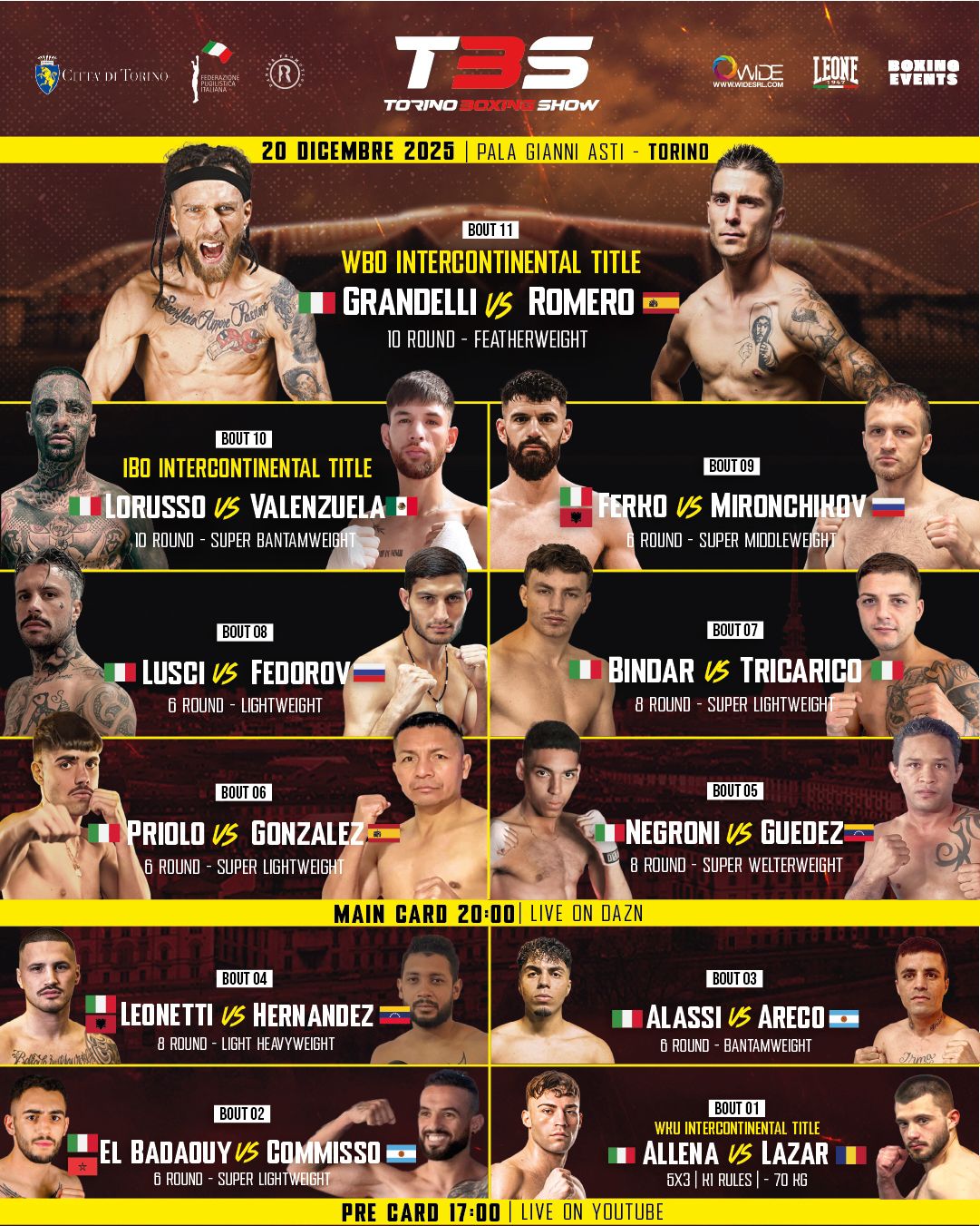 L’ultimo match della serata è previsto per le ore 23:15. Vedrà il campione/beniamino locale, il 31enne torinese Francesco “Kekko” Grandelli (ITA), forte di uno score di 20 successi 4 sconfitte e 2 pari, già titolato due volte in ambito nazionale (oltre che a livello EBU Silver e WBC International), affrontare, in 10 round, nella categoria di peso fino a 57 kg (“featherweight”), per la difesa del titolo Intercontinentale WBO (conquistato ai punti lo scorso 8 giugno 2025 a Firenze contro il forte toscano Simone Rao), il 36enne di Almeria (Andalucia), ma residente in Finlandia, José Antonio Sanchez Romero (SPA/17-2-1). Per Grandelli è una prima difesa tra l’altro nella ua città natale.
