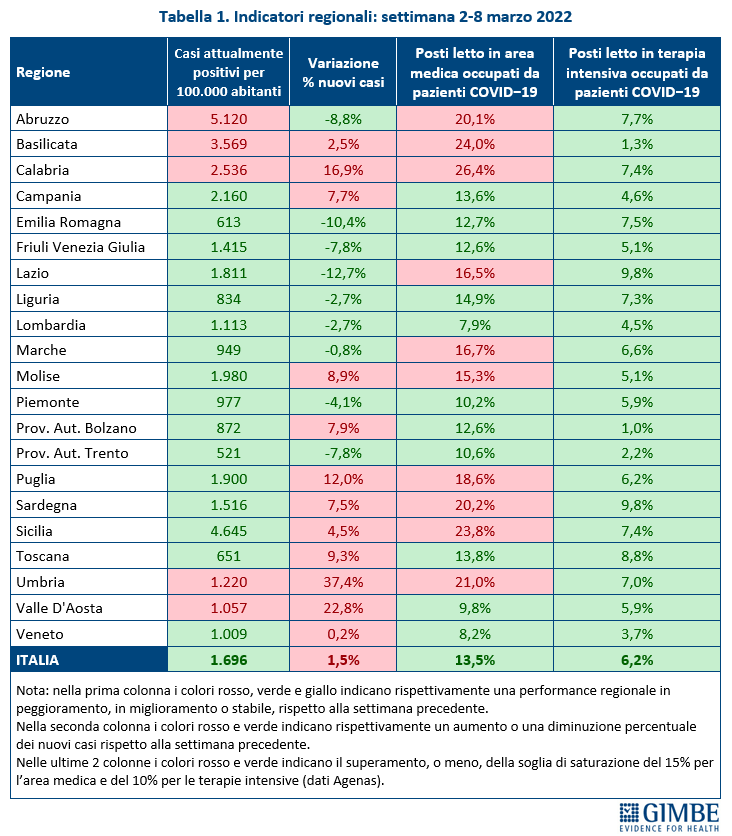 Nella settimana 2-8 marzo si rileva un incremento percentuale dei nuovi casi in 12 Regioni e una riduzione in 9: dal +37,4% dell’Umbria al -12,7% del Lazio. In quasi metà delle Province (49) si registra un incremento percentuale dei nuovi casi rispetto alla settimana precedente. Salgono da 42 a 48 le Province con incidenza superiore a 500 casi per 100.000 abitanti: Lecce (1.035), Agrigento (924), Reggio di Calabria (920), Messina (906), Ragusa (859), Vibo Valentia (849), Trapani (842), Perugia (815), Ascoli Piceno (795), Fermo (763), Grosseto (737), Oristano (735), Matera (735), Siena (717), Terni (716), Siracusa (704), Bolzano (675), Crotone (669), Sassari (668), Lucca (668), Campobasso (645), Arezzo (636), Macerata (634), Ancona (633), Enna (633), Palermo (633), Venezia (632), Cosenza (631), Benevento (630), Caltanissetta (629), Livorno (582), Foggia (579), Padova (568), Chieti (564), Caserta (563), Rieti (560), Bari (559), Isernia (559), Frosinone (559), L'Aquila (556), Latina (555), Massa Carrara (553), Teramo (550), Potenza (548), Avellino (546), Cagliari (518), Taranto (518) e Pescara (516).