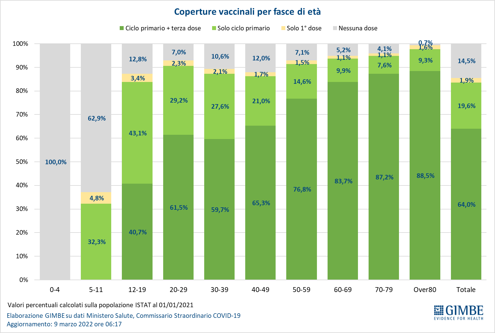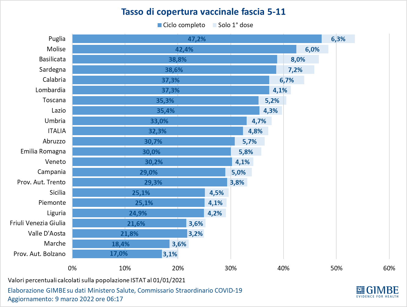 Vaccini: fascia 5-11 anni. Al 9 marzo (aggiornamento ore 06.17) nella fascia 5-11 anni sono state somministrate 2.373.493 dosi: 1.362.161 hanno ricevuto almeno 1 dose di vaccino (di cui 1.186.667 hanno completato il ciclo vaccinale), con un tasso di copertura nazionale che si attesta al 37,1% con nette differenze regionali (dal 20,1% della Provincia Autonoma di Bolzano al 53,5% della Puglia).