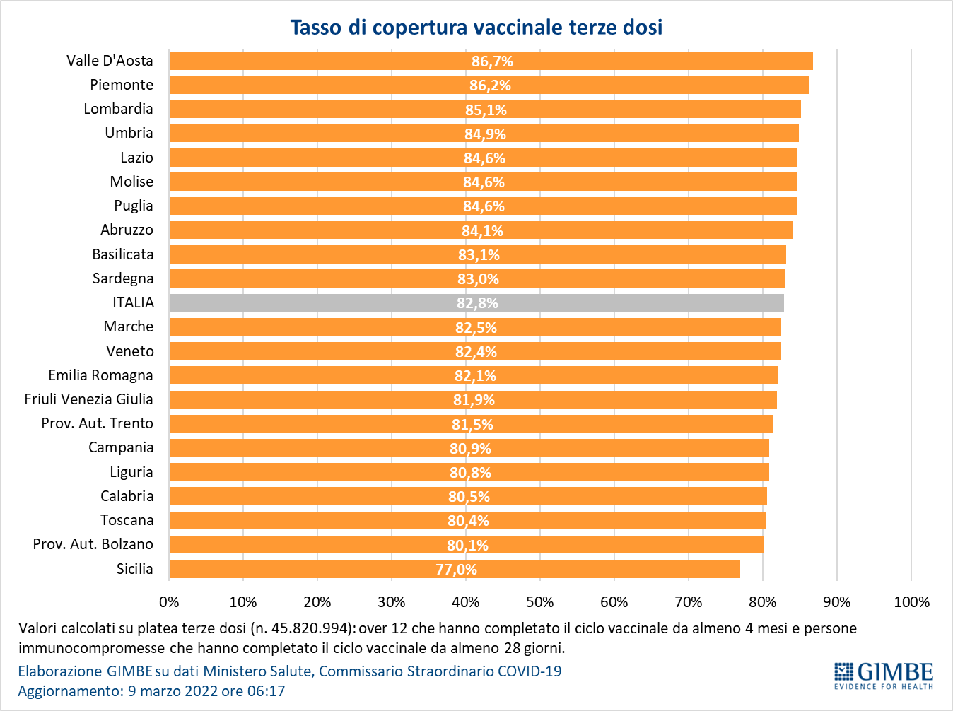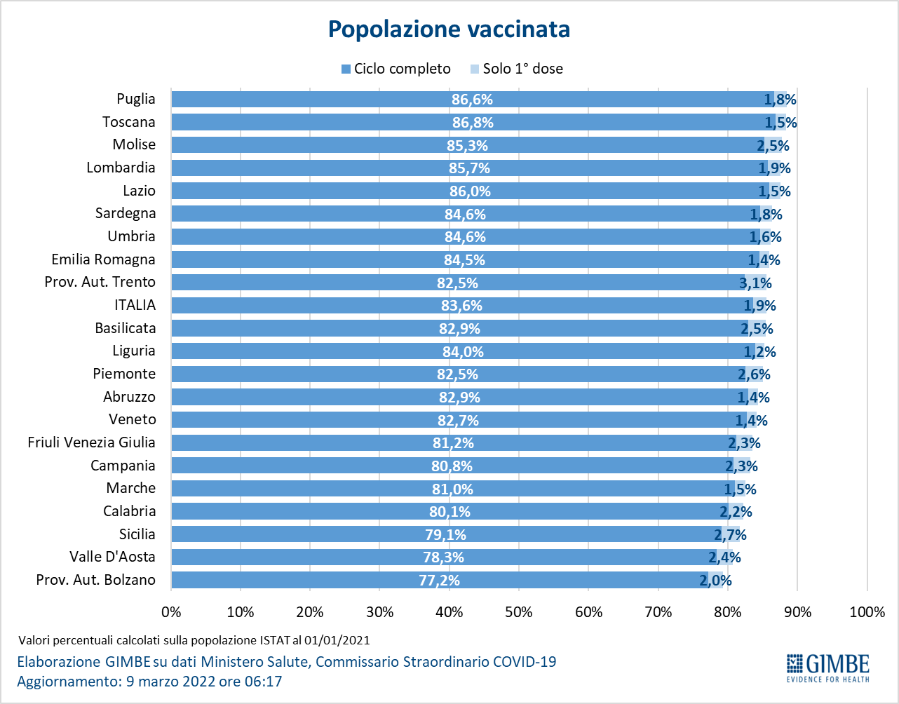 Vaccini: terza dose. Al 9 marzo (aggiornamento ore 06.17) sono state somministrate 37.938.907 terze dosi con una media mobile a 7 giorni di 48.768 somministrazioni/die. In base alla platea ufficiale (n. 45.820.994), aggiornata al 4 marzo, il tasso di copertura nazionale per le terze dosi è dell’83% con nette differenze regionali: dal 77% della Sicilia all’86,7% della Valle D'Aosta. Delle 7.882.087 persone che ancora non hanno ricevuto la dose booster, più di 2,8 milioni potrebbero riceverla subito, mentre gli oltre 4,5 milioni guariti da meno di 4 mesi non sono candidati a riceverla nell’immediato.