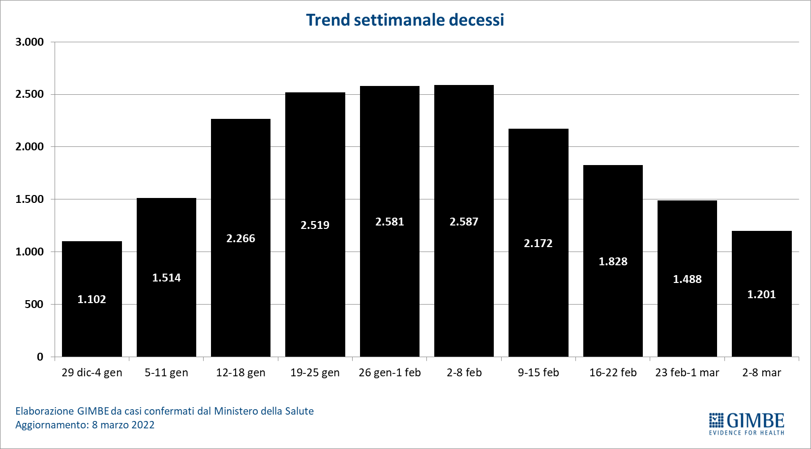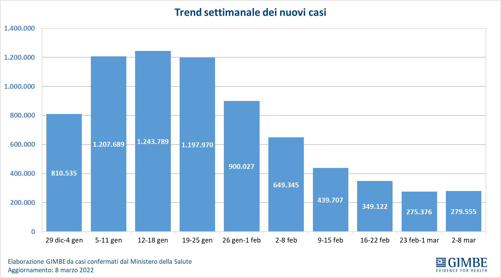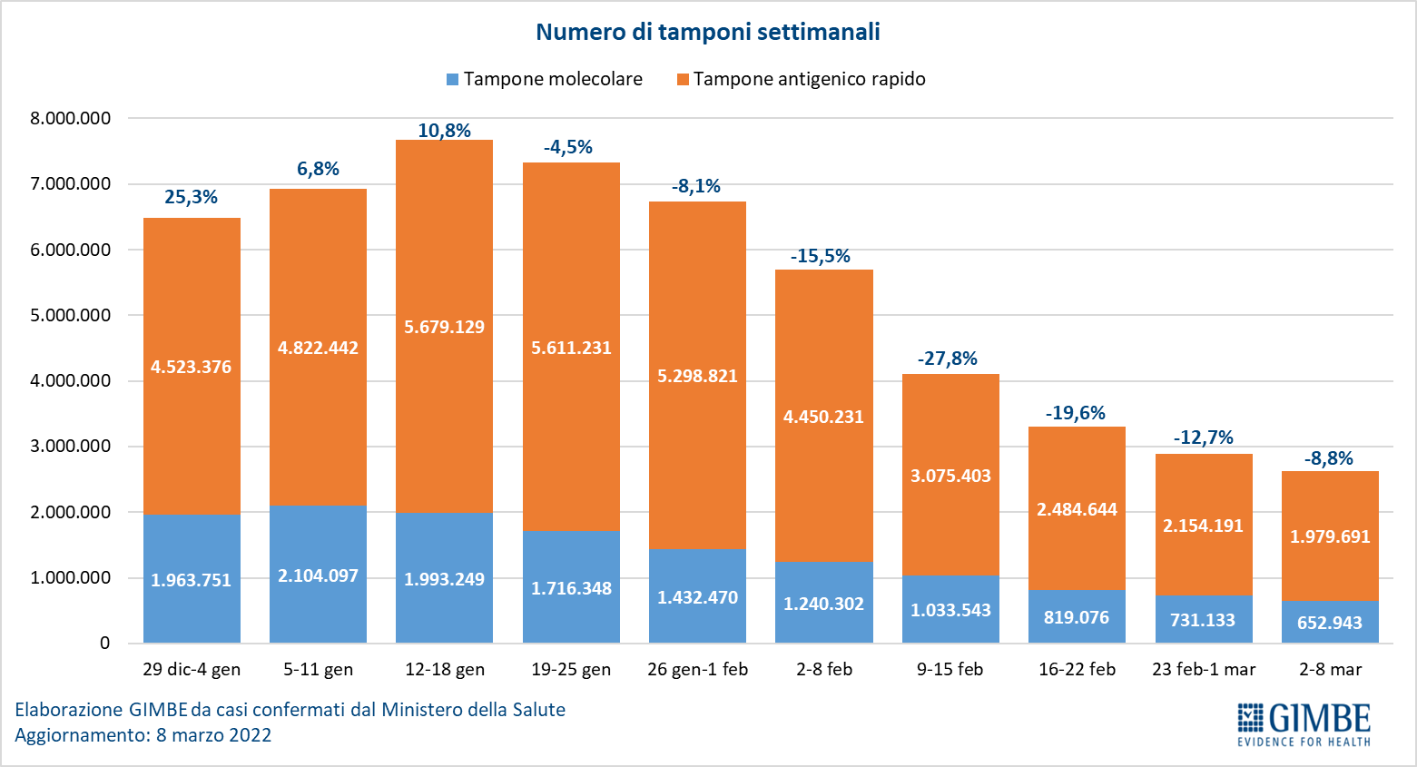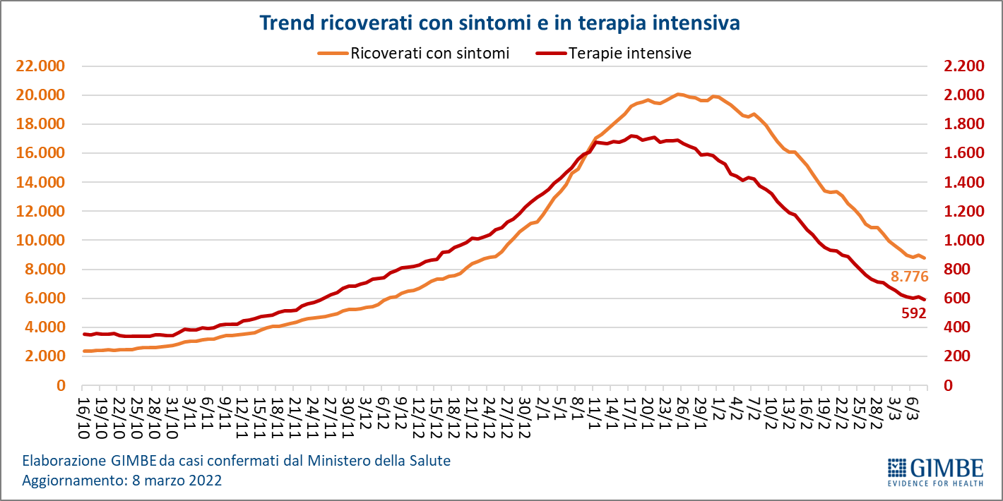 Il monitoraggio indipendente della Fondazione GIMBE rileva nella settimana 2-8 marzo 2022, rispetto alla precedente, un lieve aumento di nuovi casi (279.555 vs 275.376) e una diminuzione dei decessi (1.201 vs 1.488). In calo anche i casi attualmente positivi (1.011.521 vs 1.073.230), le persone in isolamento domiciliare (1.002.153 vs 1.062.066), i ricoveri con sintomi (8.776 vs 10.456) e le terapie intensive (592 vs 708). In dettaglio, rispetto alla settimana precedente, si registrano le seguenti variazioni: