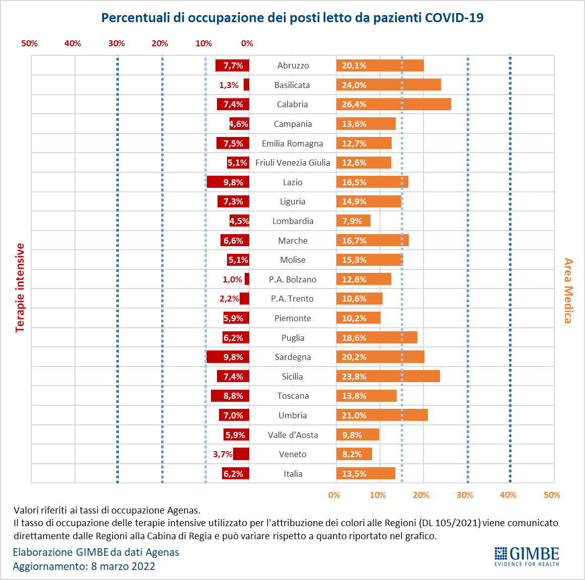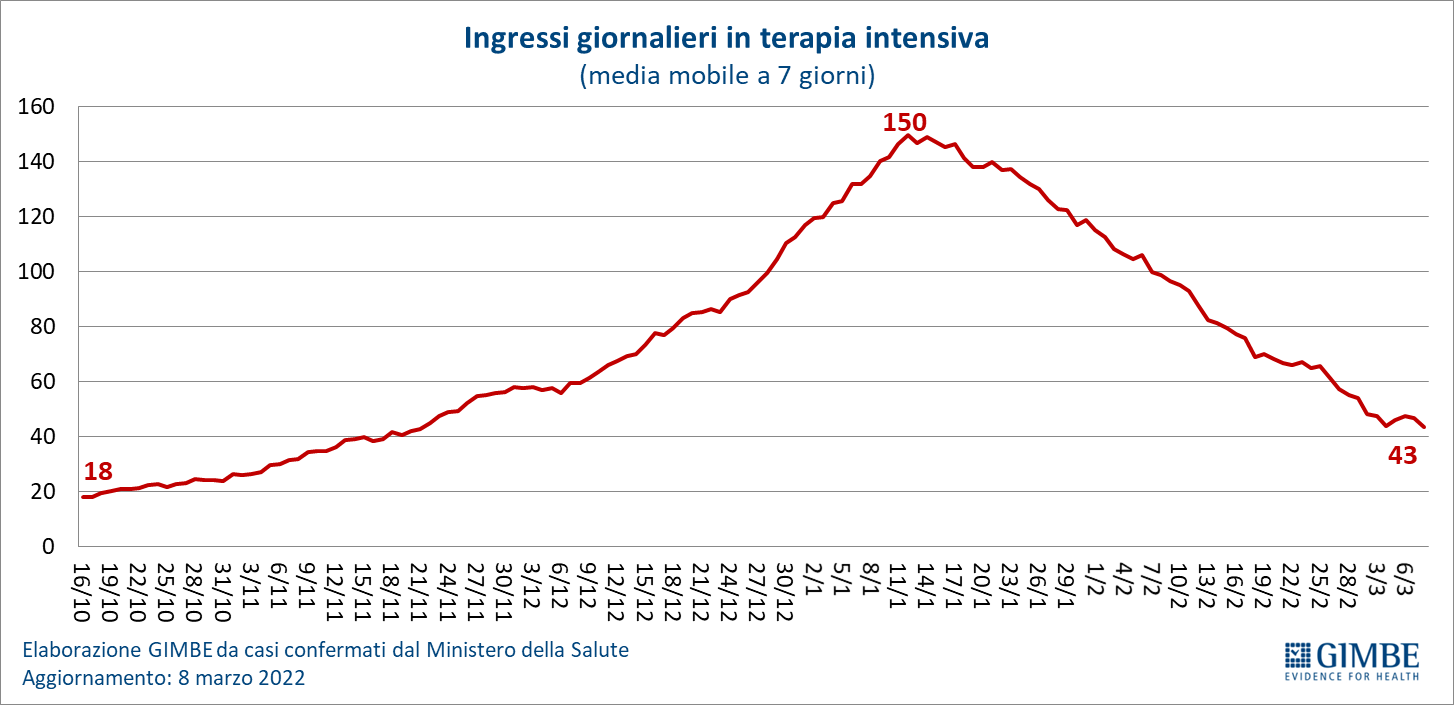 Ospedalizzazioni. “Sul fronte degli ospedali – afferma Renata Gili, responsabile Ricerca sui Servizi Sanitari della Fondazione GIMBE – i posti letto occupati da pazienti COVID diminuiscono ulteriormente sia in area medica (-16,1%) che in terapia intensiva (-16,4%)”. In particolare, in area critica dal picco di 1.717 del 17 gennaio i ricoveri scendono a 592 l’8 marzo; in area medica dal picco di 19.913 del 31 gennaio a 8.776 l’8 marzo. All’8 marzo il tasso nazionale di occupazione da parte di pazienti COVID è del 13,5% in area medica e del 6,2% in area critica. Abruzzo, Basilicata, Calabria, Lazio, Marche, Molise, Puglia, Sardegna, Sicilia e Umbria superano la soglia del 15% in area medica; nessuna Regione va oltre la soglia del 10% in area critica. “Si conferma un’ulteriore riduzione degli ingressi giornalieri in terapia intensiva – puntualizza Marco Mosti, Direttore Operativo della Fondazione GIMBE – la cui media mobile a 7 giorni scende a 43 ingressi/die rispetto ai 54 della settimana precedente”.