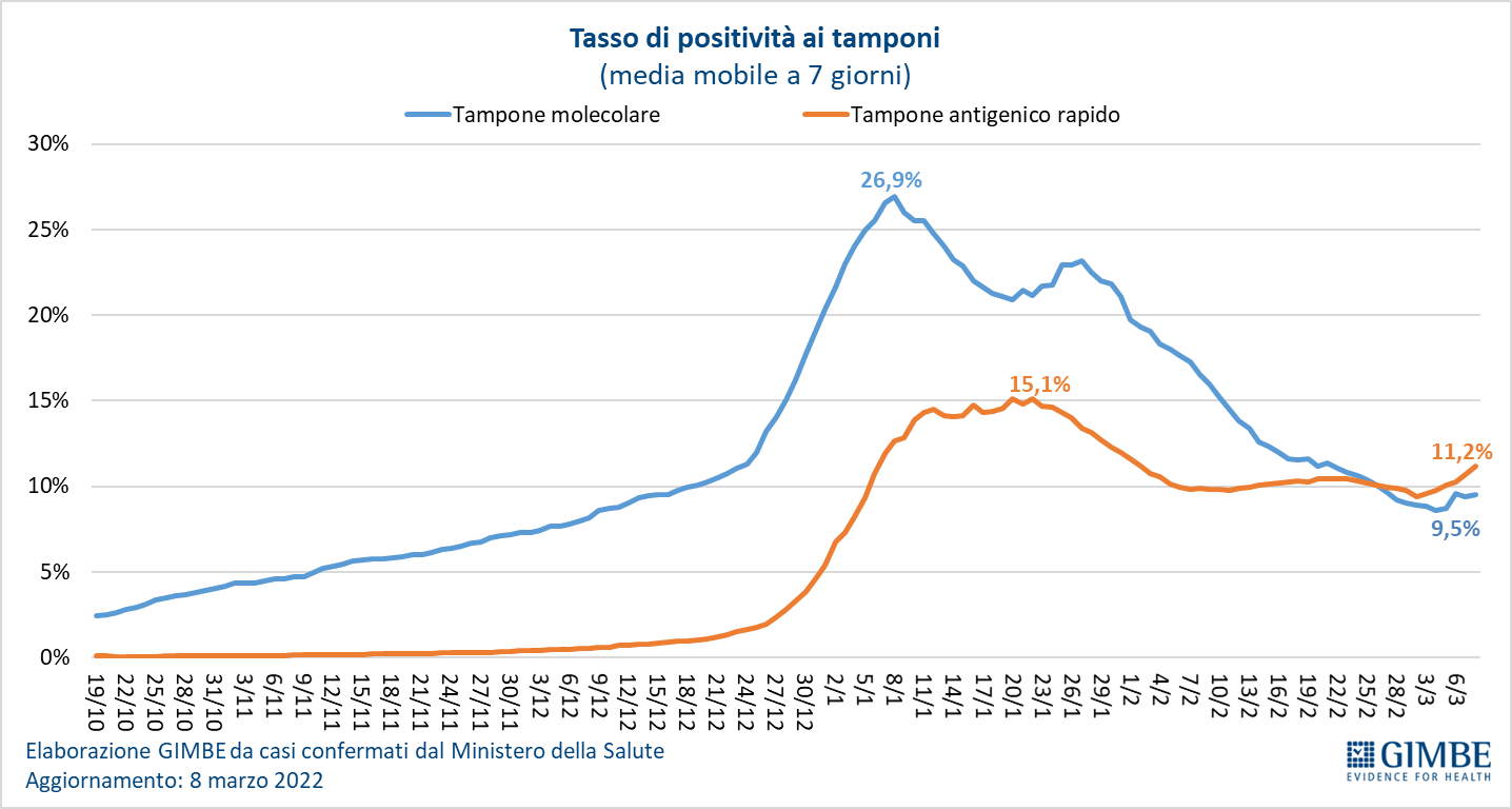 Testing. Il numero dei tamponi totali scende ulteriormente da 2.885.324 della settimana 23 febbraio 2022-1 marzo 2022 a 2.632.634 della settimana 2-8 marzo 2022(-8,8%). In particolare, i tamponi rapidi si sono ridotti dell’8,1% (-174.500) e quelli molecolari del 10,7% (-78.190). La media mobile a 7 giorni del tasso di positività dei tamponi molecolari sale dal 9,2% al 9,5%, mentre per gli antigenici rapidi dal 9,7% al 11,2%.