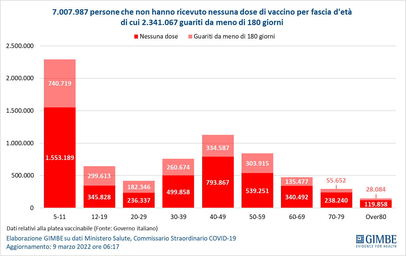 Vaccini: persone non vaccinate. Al 9 marzo sono 7,01 milioni le persone che non hanno ricevuto nemmeno una dose di vaccino, di cui 2,34 milioni guarite da COVID-19 da meno di 180 giorni e pertanto temporaneamente protette: le persone attualmente vaccinabili sono dunque circa 4,67 milioni, un dato che non tiene conto delle esenzioni di cui non si conosce il numero esatto.