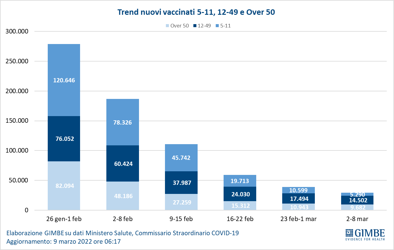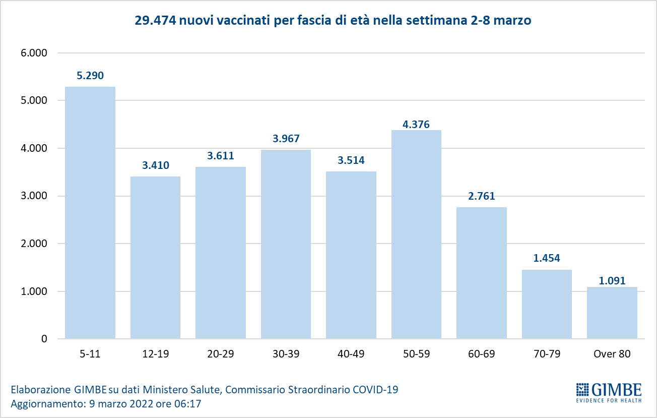 Vaccini: nuovi vaccinati. Nella settimana 2-8 marzo si registra un ulteriore calo dei nuovi vaccinati: 29.474 rispetto ai 39.036 della settimana precedente (-24,5%). Di questi il 17,9% è rappresentato dalla fascia 5-11: 5.290, un numero dimezzato rispetto alla settimana precedente (-50,1%). Nonostante l’obbligo vaccinale e l’obbligo di green pass rafforzato sui luoghi di lavoro, tra gli over 50 il numero di nuovi vaccinati scende ancora, attestandosi a quota 9.682 (-11,5% rispetto alla settimana precedente).