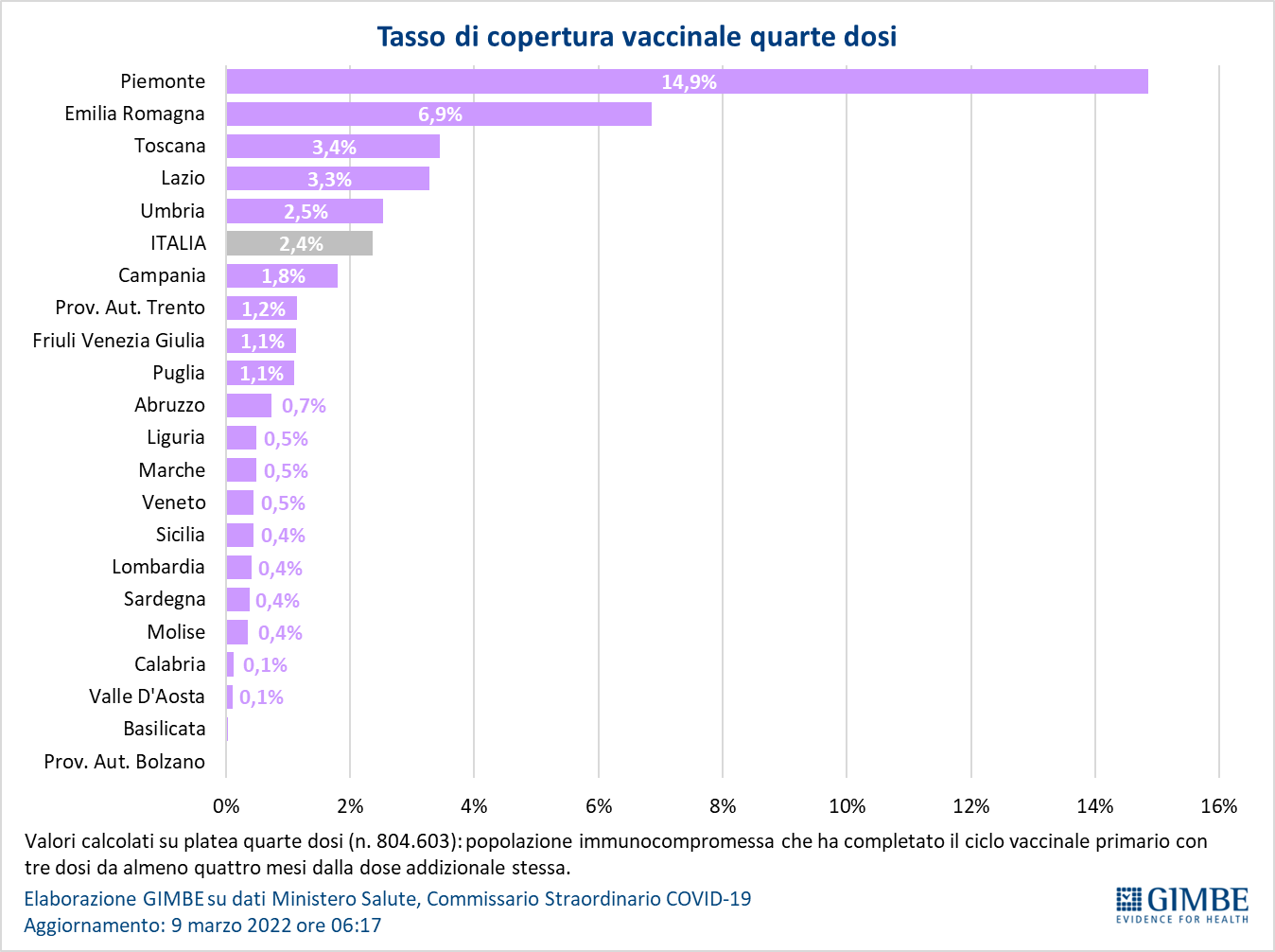 Vaccini: quarta dose. Al 9 marzo (aggiornamento ore 06.17) sono state somministrate 18.973 quarte dosi, attualmente indicate per le persone immunocompromesse che hanno completato il ciclo primario con tre dosi. In base alla platea ufficiale (n. 804.603), aggiornata al 1° marzo, il tasso di copertura nazionale per le quarte dosi è del 2,4% con nette differenze regionali: dallo 0% di Provincia Autonoma di Bolzano e Basilicata al 14,9% del Piemonte.