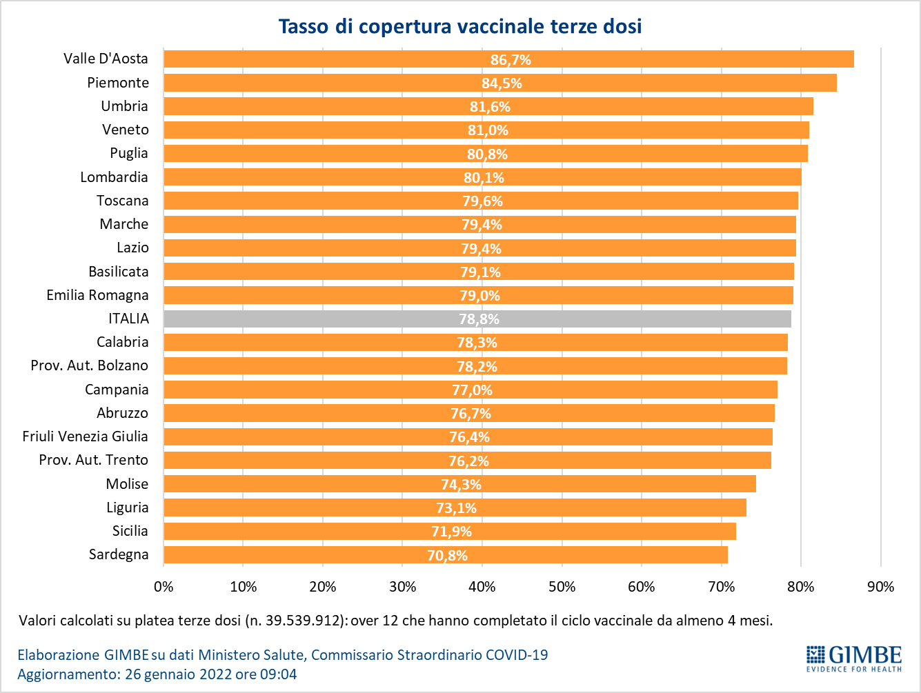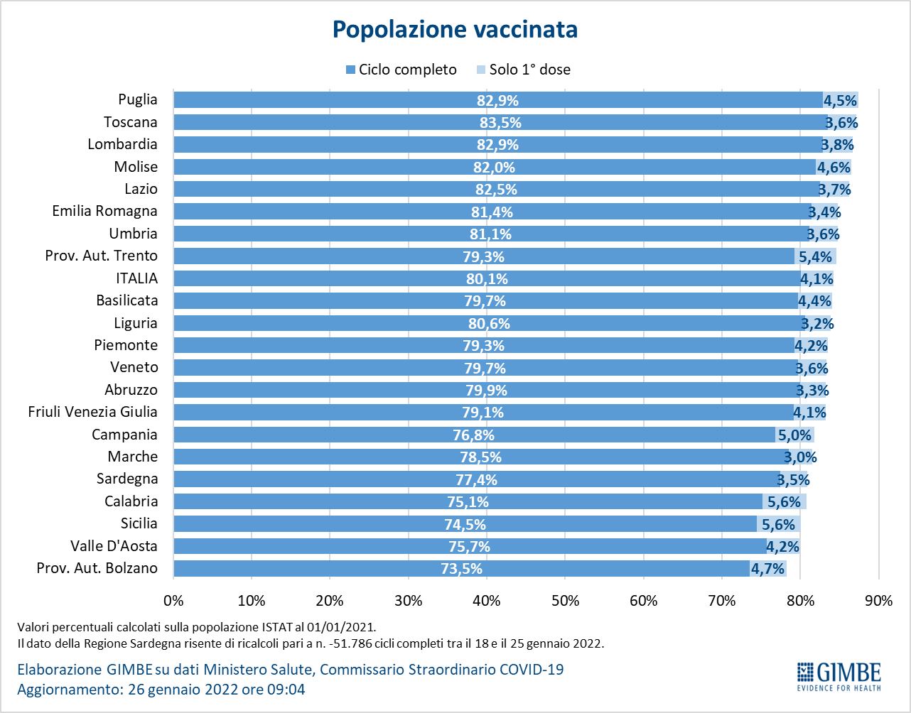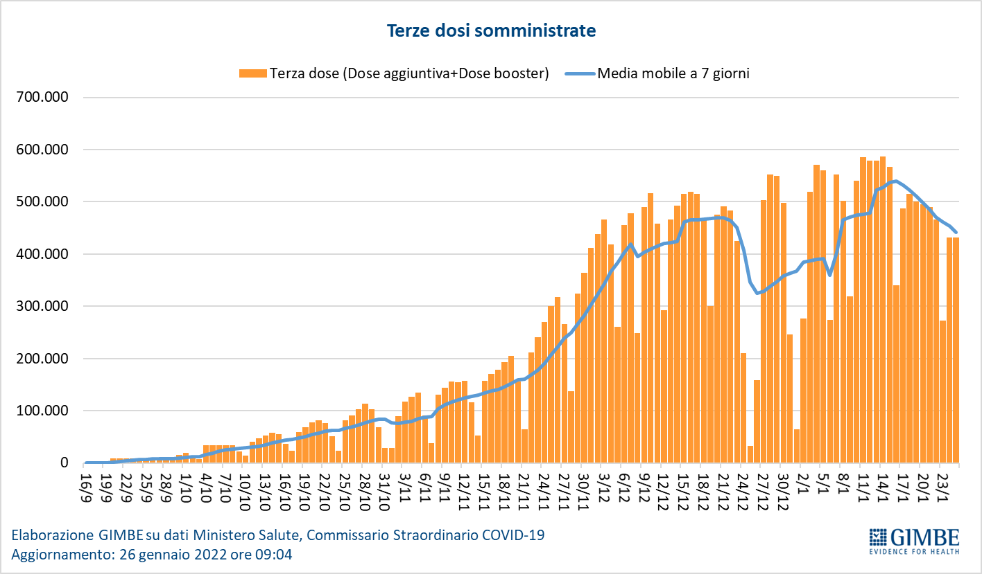 Vaccini: terza dose. Al 26 gennaio (aggiornamento ore 09.04) sono state somministrate 31.138.488 terze dosi con una media mobile a 7 giorni di 441.180 somministrazioni al giorno. In base alla platea ufficiale (n. 39.539.599), aggiornata al 21 gennaio, il tasso di copertura nazionale per le terze dosi è del 78,8% con nette differenze regionali: dal 70,8% della Sardegna all’86,7% della Valle D’Aosta.
