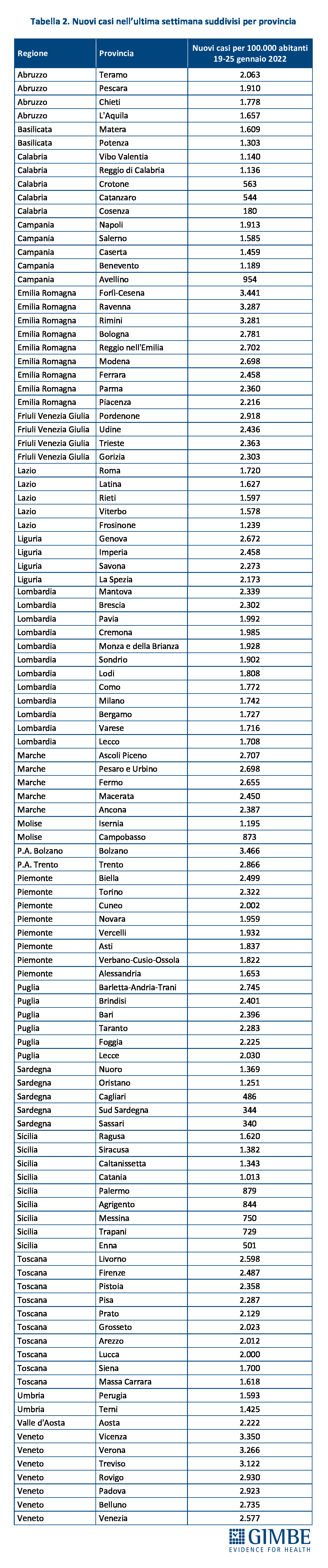 In 51 Province l’incidenza supera i 2.000 casi per 100.000 abitanti: Bolzano (3.466), Forlì-Cesena (3.441), Vicenza (3.350), Ravenna (3.287), Rimini (3.281), Verona (3.266), Treviso (3.122), Rovigo (2.930), Padova (2.923), Pordenone (2.918), Trento (2.866), Bologna (2.781), Barletta-Andria-Trani (2.745), Belluno (2.735), Ascoli Piceno (2.707), Reggio nell'Emilia (2.702), Modena (2.698), Pesaro e Urbino (2.698), Genova (2.672), Fermo (2.655), Livorno (2.598), Venezia (2.577), Biella (2.499), Firenze (2.487), Imperia (2.458), Ferrara (2.458), Macerata (2.450), Udine (2.436), Brindisi (2.401), Bari (2.396), Ancona (2.387), Trieste (2.363), Parma (2.360), Pistoia (2.358), Mantova (2.339), Torino (2.322), Gorizia (2.303), Brescia (2.302), Pisa (2.287), Taranto (2.283), Savona (2.273), Foggia (2.225), Aosta (2.222), Piacenza (2.216), La Spezia (2.173), Prato (2.129), Teramo (2.063), Lecce (2.030), Grosseto (2.023), Arezzo (2.012) e Cuneo (2.002).