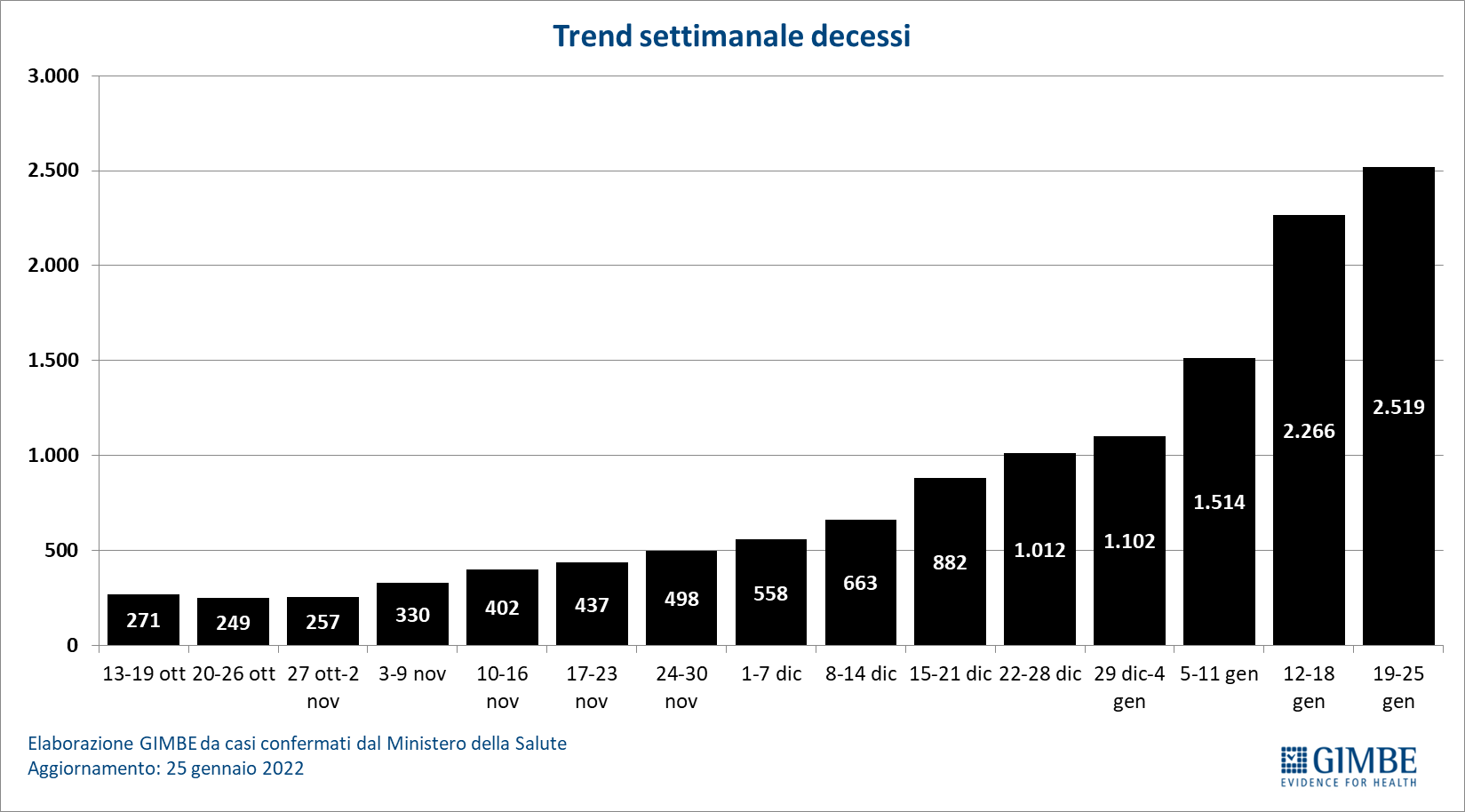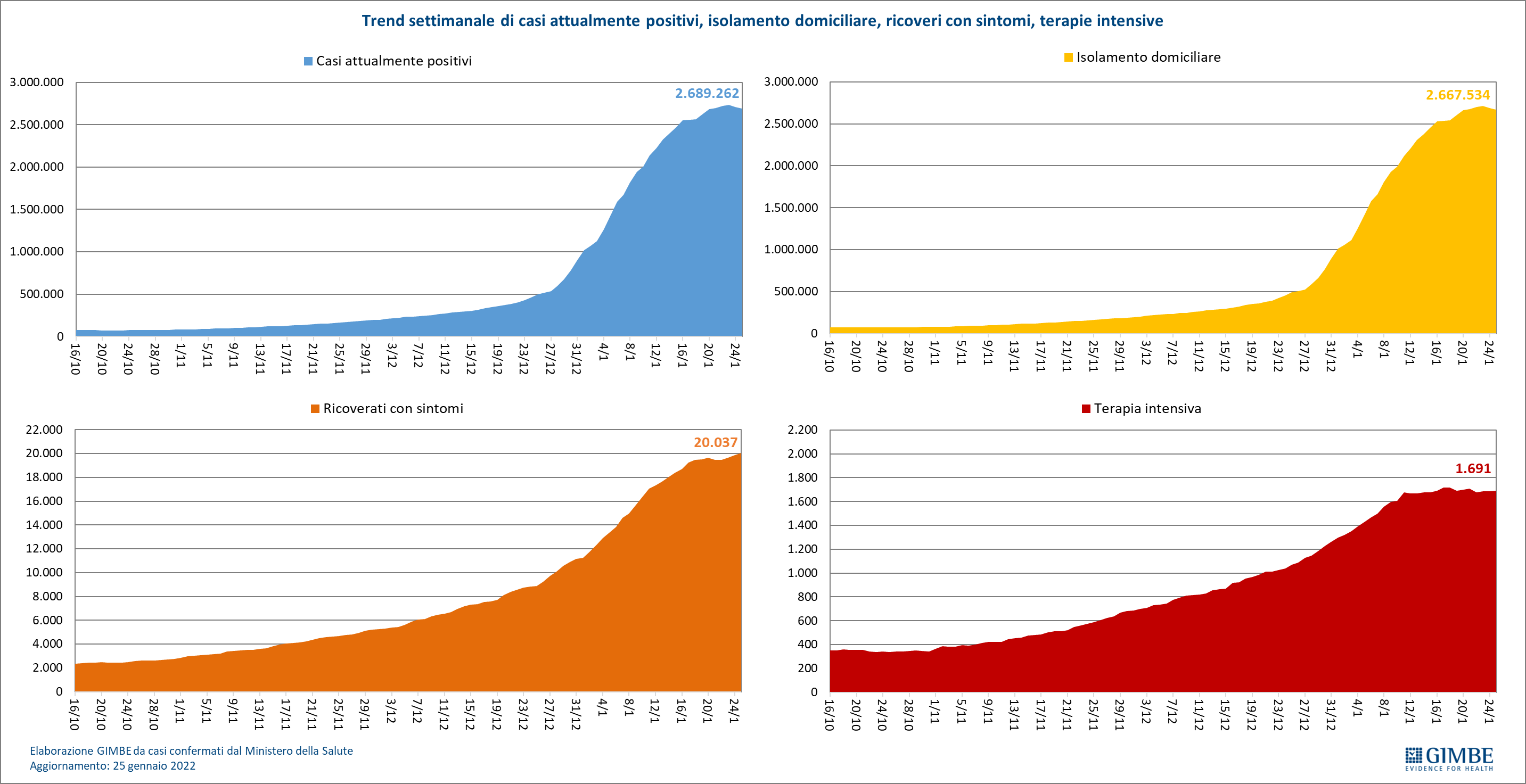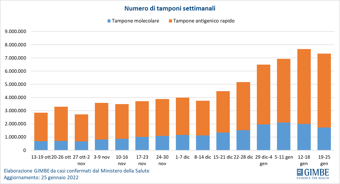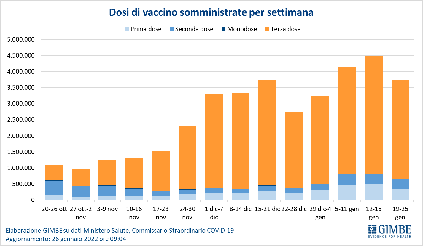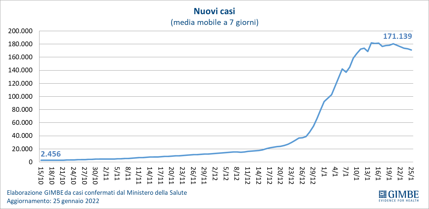 Il monitoraggio indipendente della Fondazione GIMBE rileva nella settimana 19-25 gennaio 2022, rispetto alla precedente, una lieve diminuzione di nuovi casi (1.197.970 vs 1.243.789) e un aumento dei decessi (2.519 vs 2.266).
