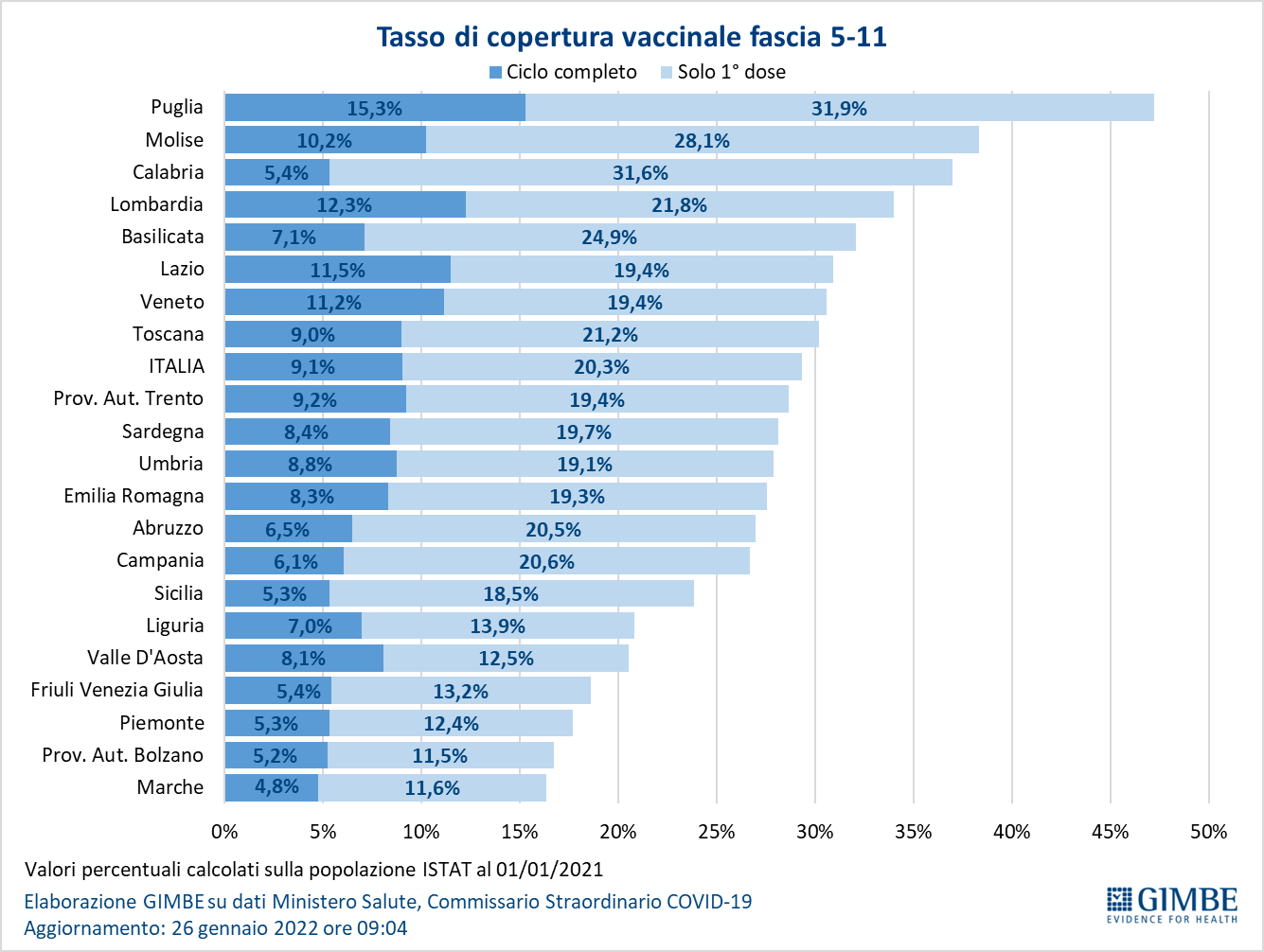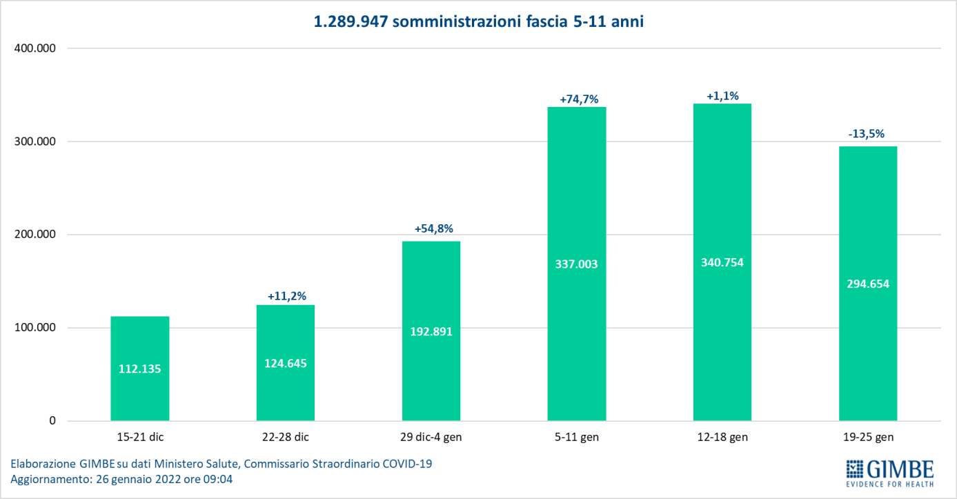 Vaccini: fascia 5-11 anni. Al 26 gennaio (aggiornamento ore 09.04) nella fascia 5-11 anni sono state somministrate 1.289.947 dosi: 1.076.537 hanno ricevuto almeno 1 dose di vaccino (di cui 332.517 hanno completato il ciclo vaccinale), con un tasso di copertura nazionale che si attesta al 29,3% con nette differenze regionali (dal 16,4% delle Marche al 47,2% della Puglia).