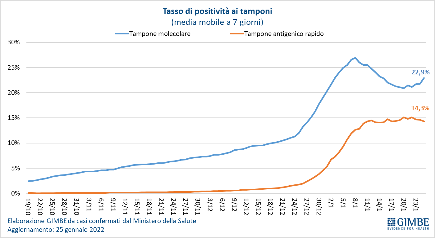 Testing. Si registra un calo del numero dei tamponi totali (-4,5%), passati da 7.672.378 della settimana 12-18 gennaio a 7.327.579 della settimana 19-25 gennaio, con una diminuzione sia dei tamponi rapidi (-67.898; -1,2%) che di quelli molecolari (-276.901; -13,9%). La media mobile a 7 giorni del tasso di positività dei tamponi molecolari torna a salire (dal 21,3% al 22,9%), mentre rimane stabile (dal 14,4% al 14,3%) quello degli antigenici rapidi.