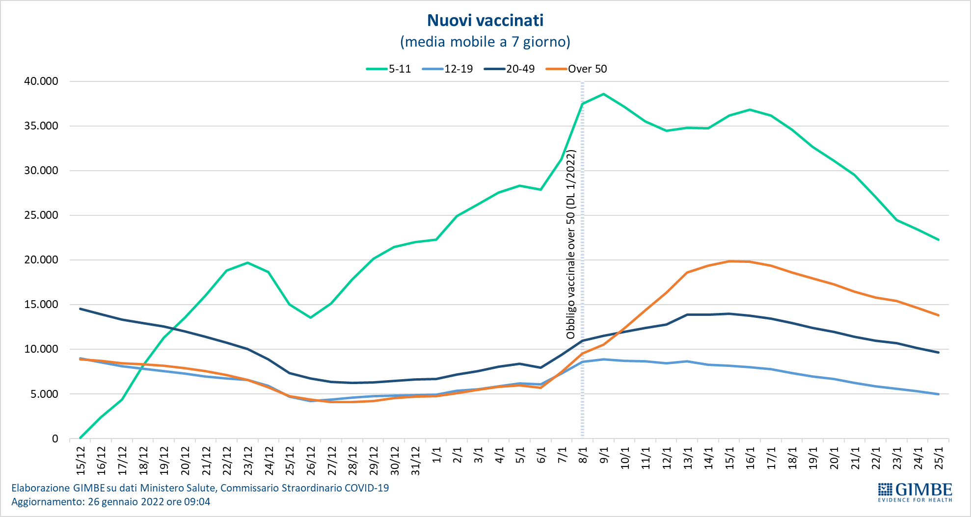 In particolare per questa fascia anagrafica la media mobile a 7 giorni dei nuovi vaccinati, dopo aver raggiunto il picco di 19.879 del 15 gennaio, è scesa a quota 13.851 il 25 gennaio; nella fascia 5-11 anni, dopo il picco di 38.624 registrato il 9 gennaio, si è stabilizzata per poi iniziare una discesa fino a quota 22.285 il 25 gennaio, inevitabilmente legata anche al rinvio delle prenotazioni vaccinali degli studenti in isolamento; in lieve, ma progressivo calo sia la fascia 12-19 che quella 20-49.
