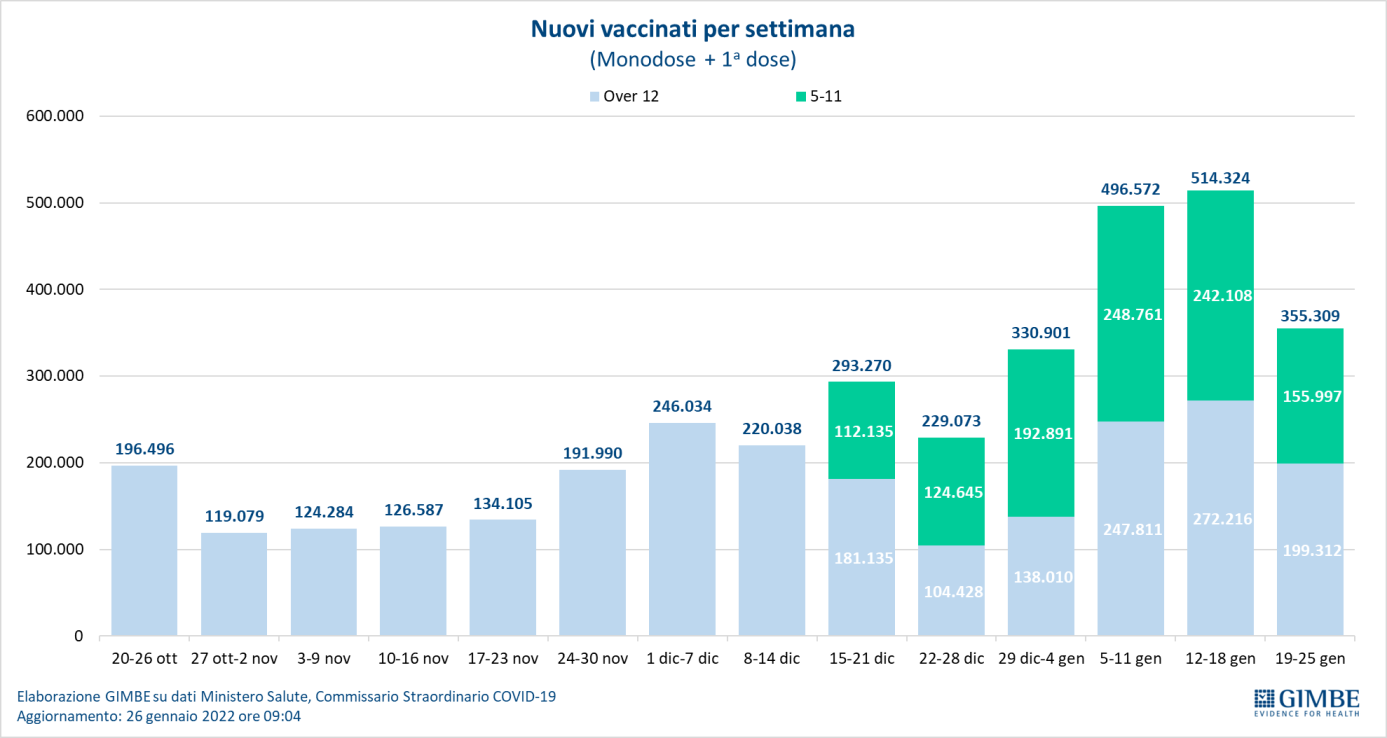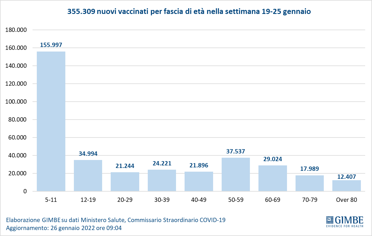 Vaccini: nuovi vaccinati. Nella settimana 19-25 gennaio si registra un crollo dei nuovi vaccinati: 355.309 rispetto ai 514.324 della settimana precedente. Di questi il 43,9% è rappresentato dalla fascia 5-11, in netta flessione rispetto alla settimana precedente (n. 155.997; -35,6%); nonostante la recente introduzione dell’obbligo vaccinale, i nuovi vaccinati over 50 scendono a 96.957 (-25,6% rispetto alla settimana precedente).