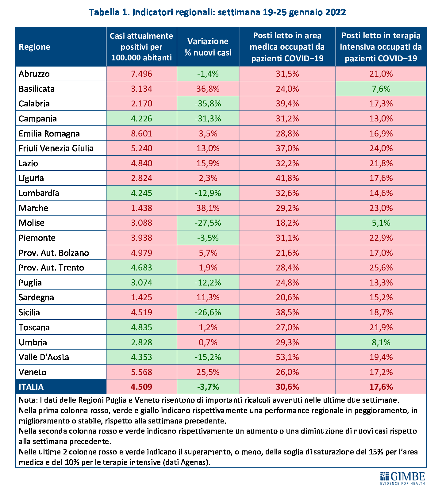 Nella settimana 19-25 gennaio in 12 Regioni si registra un incremento percentuale dei nuovi casi (dallo 0,7% dell’Umbria al 38,1% delle Marche), in 9 una riduzione (dal -1,4% dell’Abruzzo al -35,8% della Calabria); i dati delle Regioni Puglia e Veneto risentono di consistenti ricalcoli avvenuti nelle ultime due settimane.