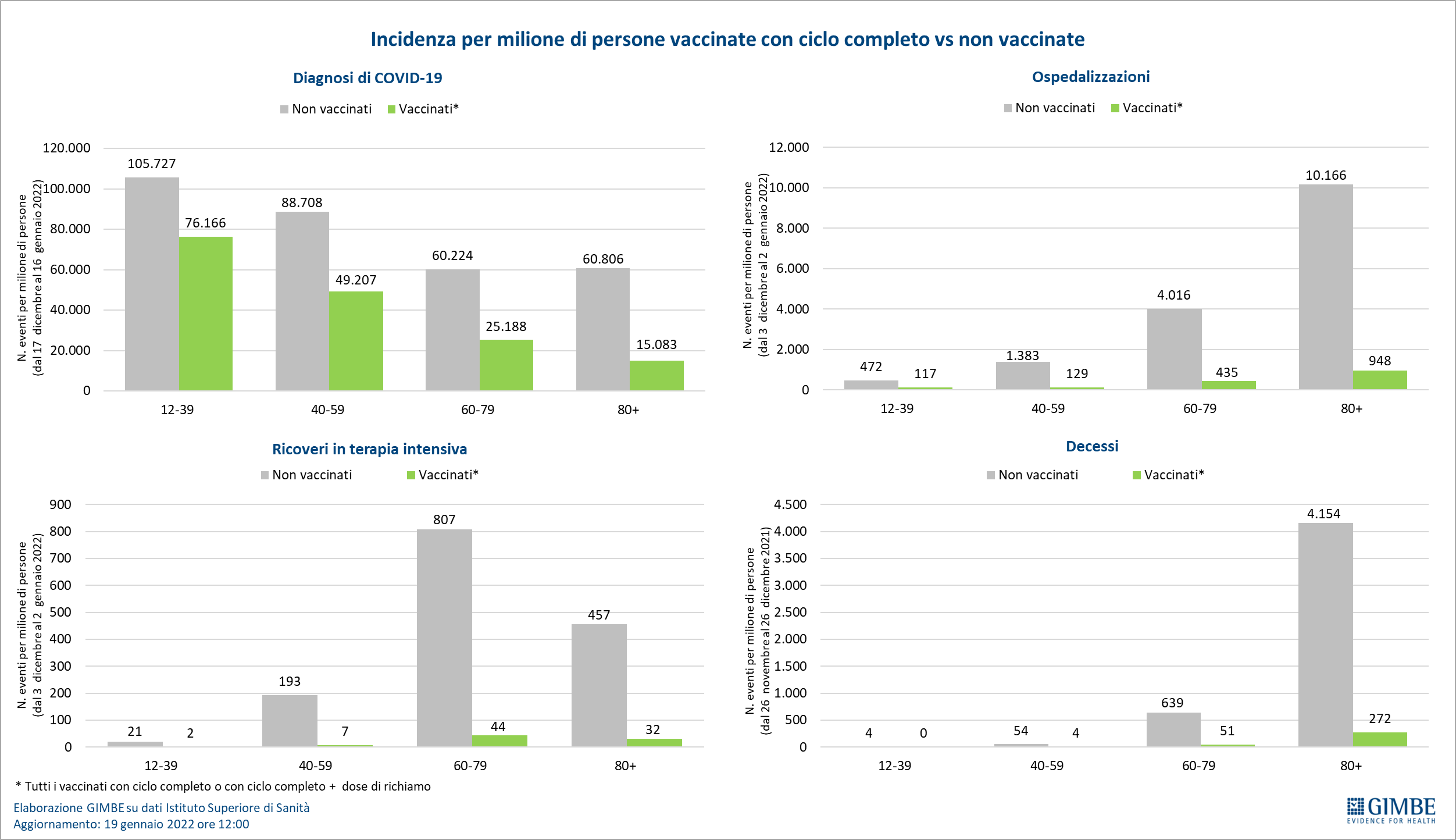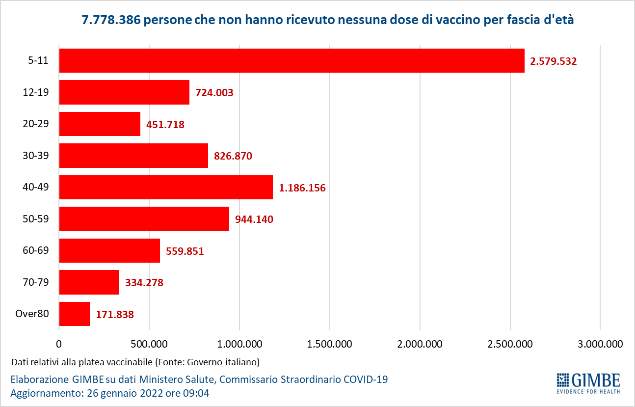 Al 18 gennaio sono ancora 7,8 milioni le persone senza nemmeno una dose di vaccino: 2,58 milioni della fascia 5-11 anni e 724 mila della fascia 12-19 che influenzano la sicurezza delle scuole, oltre a 2 milioni di over 50 ad elevato rischio di malattia grave, il vero tallone d’Achille che alimenta i ricoveri in area medica e in terapia intensiva.