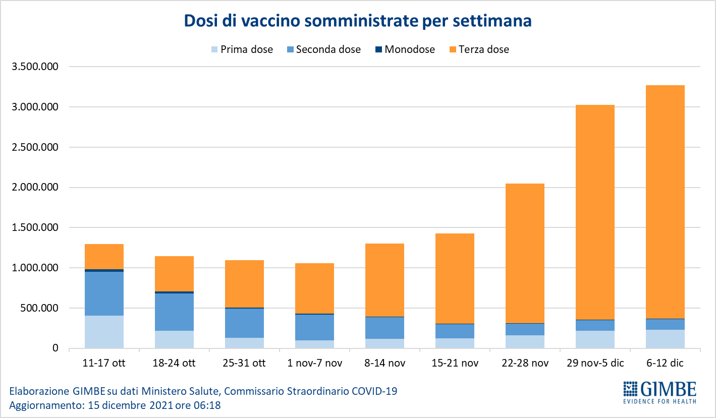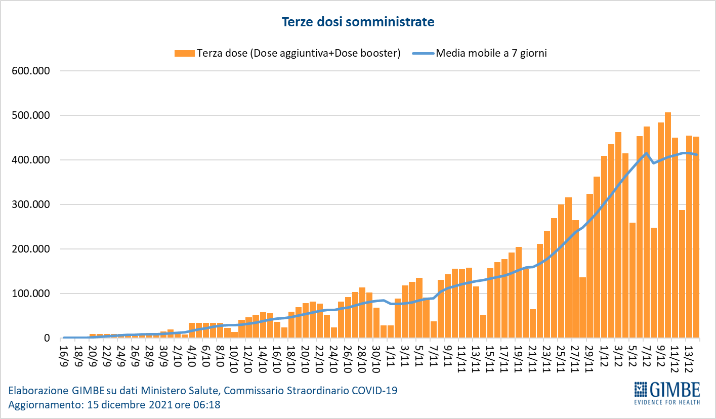 Vaccini: terza dose. Al 15 dicembre (aggiornamento ore 06.18) sono state somministrate 12.563.534 terze dosi con una media mobile a 7 giorni che si è stabilizzata intorno alle 400 mila somministrazioni al giorno (figura 15).