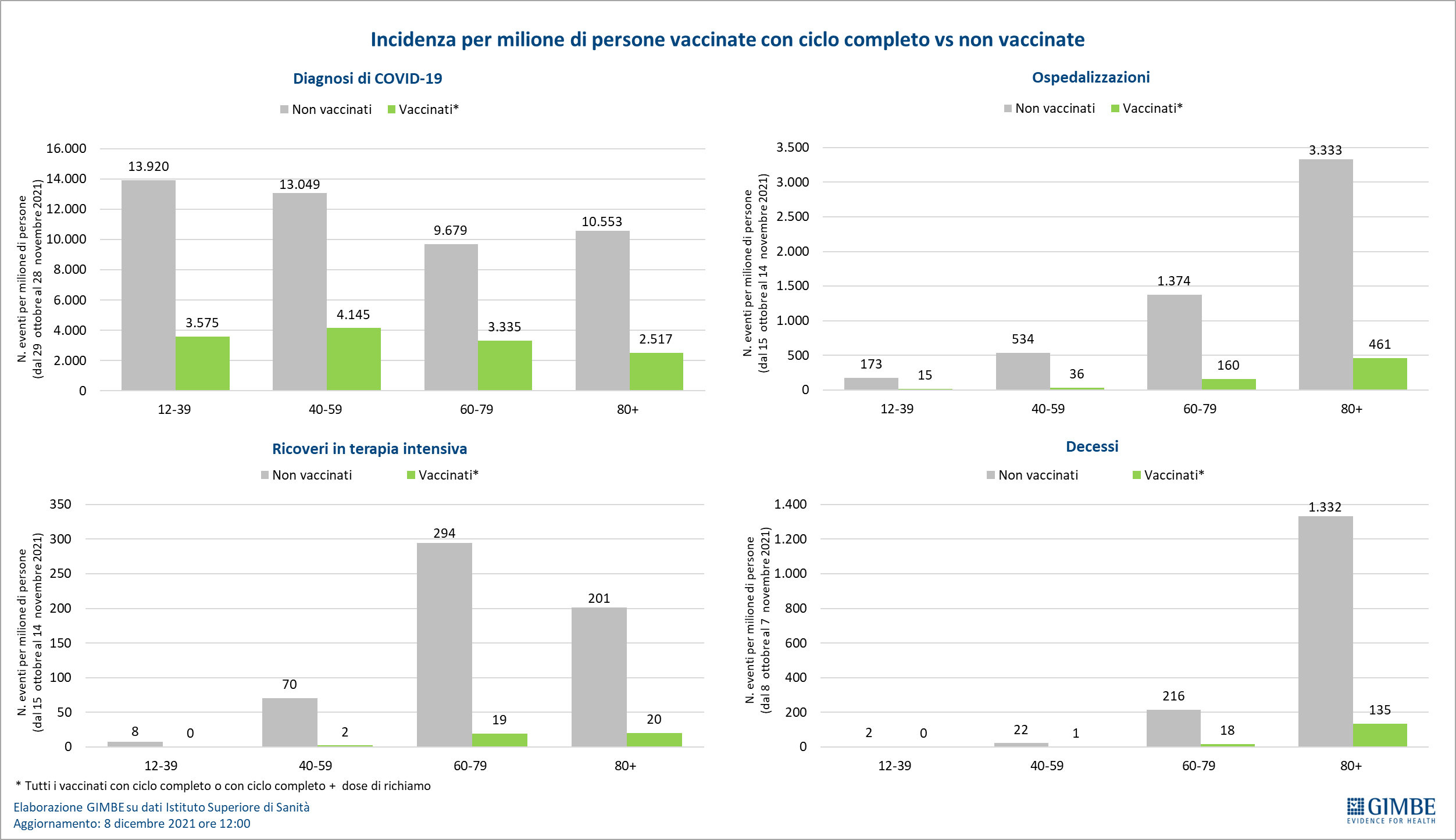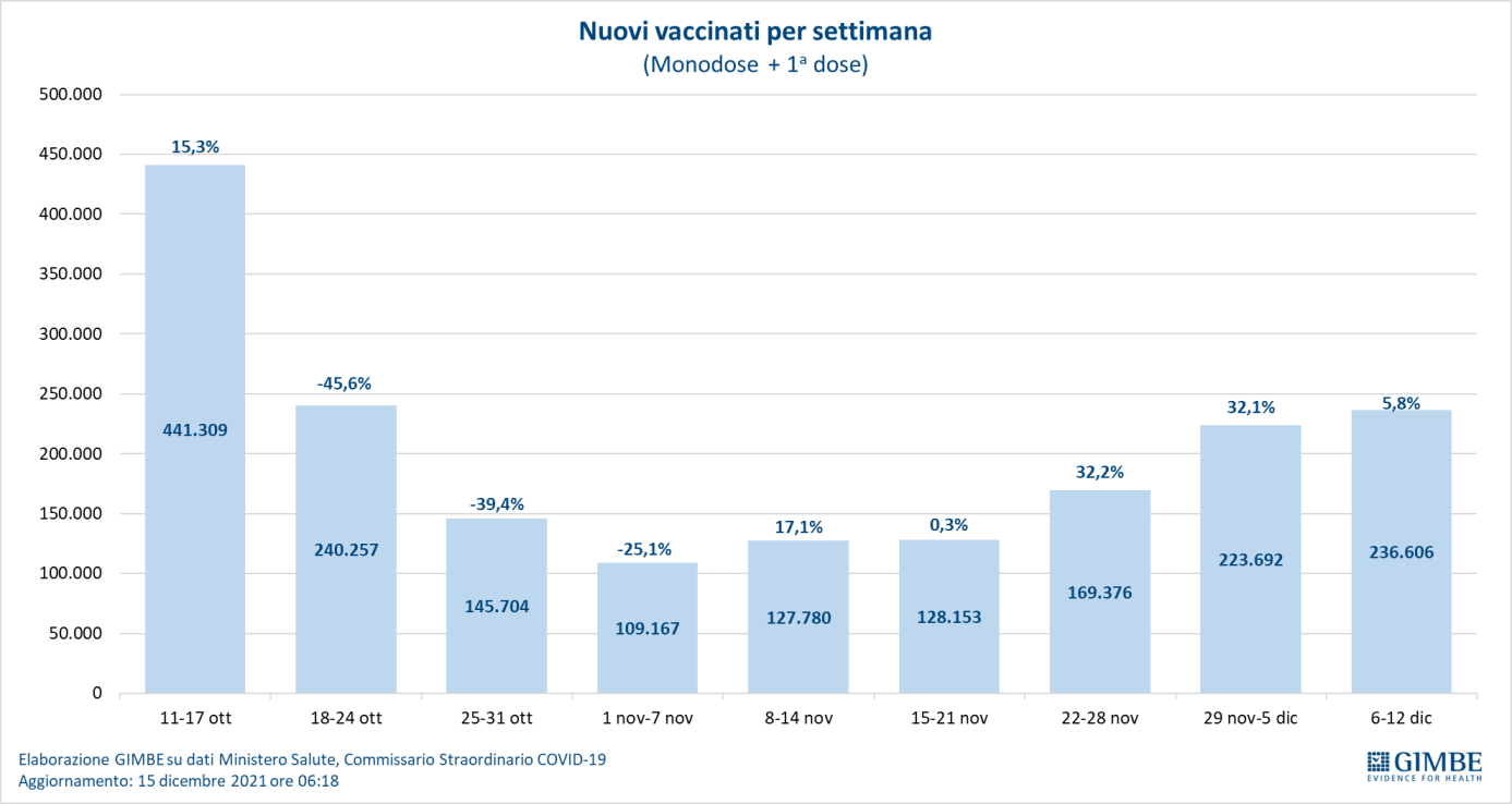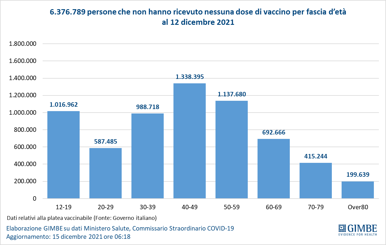 Vaccini: nuovi vaccinati. Nella settimana 6-12 dicembre il numero dei nuovi vaccinati è salito a 236.606 (+5,8%) rispetto ai 223.116 della settimana precedente (figura 11). Sono tuttavia ancora quasi 6,4 milioni le persone senza nemmeno una dose, tra cui preoccupano da un lato 2,45 milioni di over 50 ad elevato rischio di malattia grave e ospedalizzazione, dall’altro 1,02 milioni nella fascia 12-19 anni che aumentano la circolazione del virus nelle scuole (figura 12).
