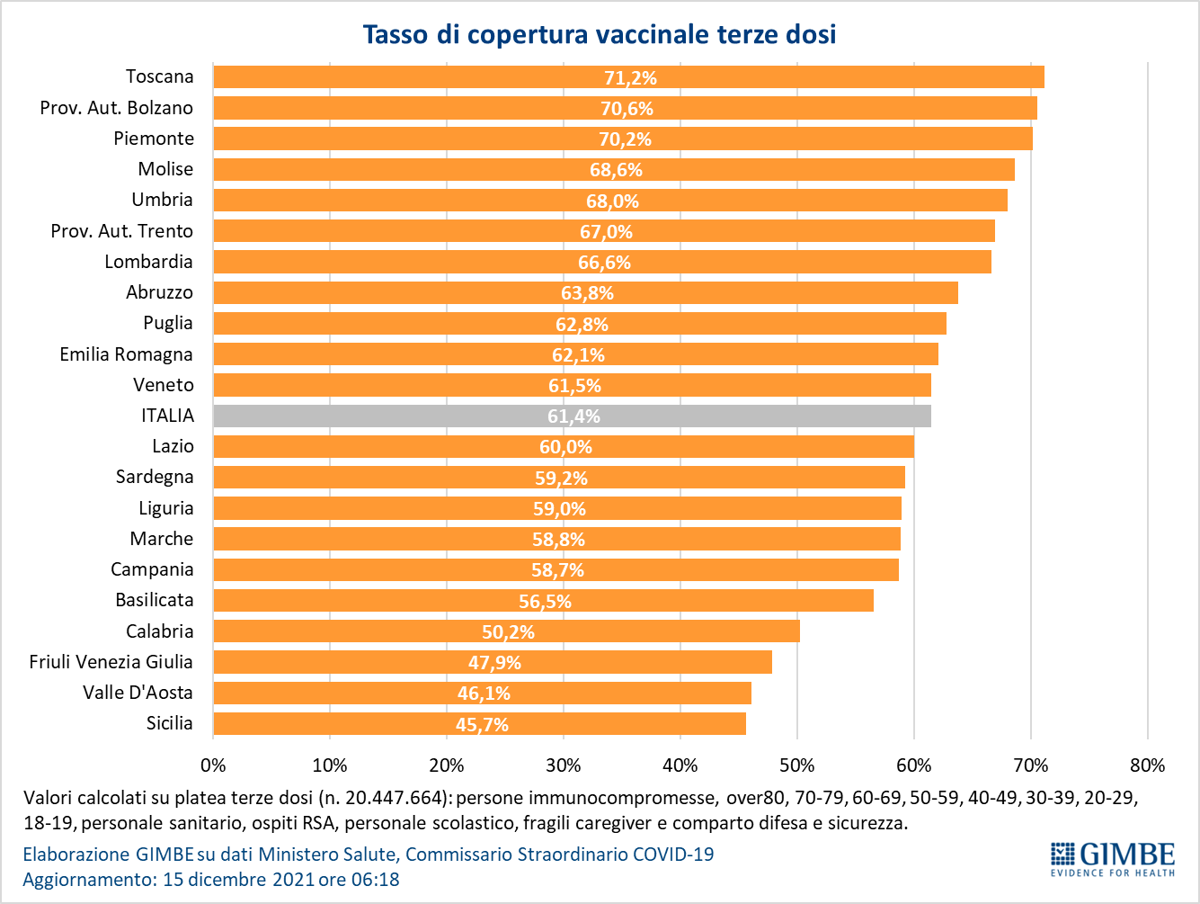 In base alla platea ufficiale (n. 20.447.664) il tasso di copertura nazionale per le terze dosi è del 61,4% con nette differenze regionali, dal 45,7% della Sicilia al 71,2% della Toscana (figura 16).