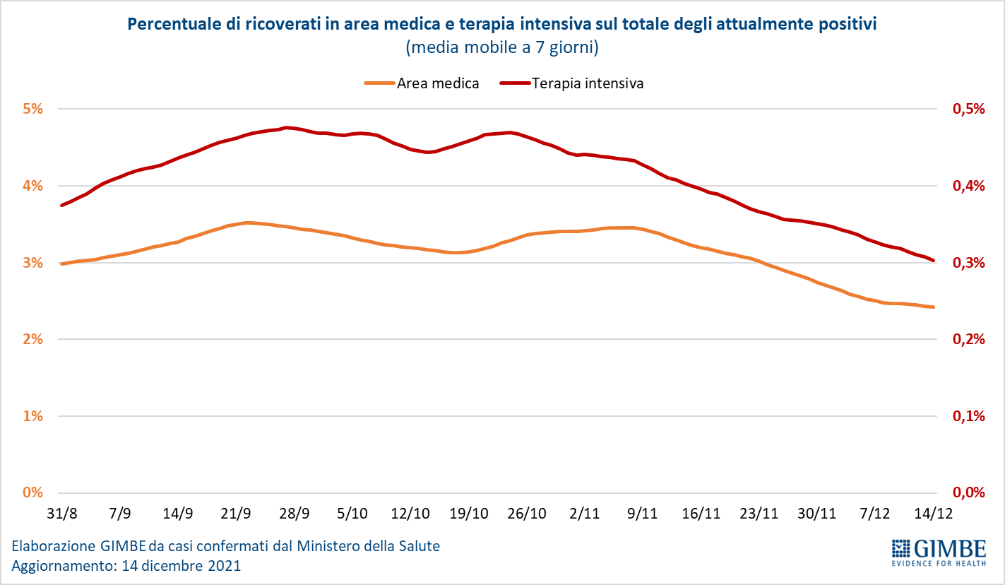 Nonostante l’aumentata pressione sugli ospedali, nelle ultime settimane si è progressivamente ridotta la percentuale dei pazienti ricoverati in area medica e in terapia intensiva sul totale degli attualmente positivi. In particolare, per l’area medica la media mobile a 7 giorni è scesa dal 3,47% del 7 novembre al 2,41% del 14 dicembre e per le terapie intensive dallo 0,47% del 21 ottobre allo 0,30% del 14 dicembre (figura 7).