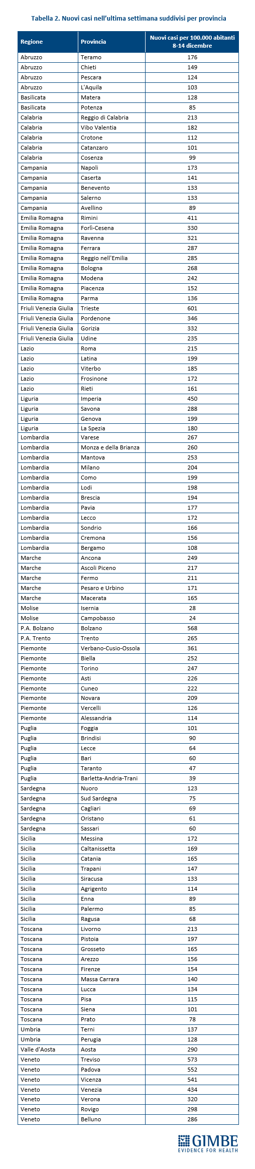 In 26 Province l’incidenza supera i 250 casi per 100.000 abitanti: Trieste (601), Treviso (573), Bolzano (568), Padova (552), Vicenza (541), Imperia (450), Venezia (434), Rimini 411), Verbano-Cusio-Ossola (361), Pordenone (346), Gorizia (332), Forlì-Cesena (330), Ravenna (321), Verona (320), Rovigo (298), Aosta (290), Savona (288), Ferrara (287), Belluno (286), Reggio nell'Emilia (285), Bologna (268), Varese (267), Trento (265), Monza e della Brianza (260), Mantova (253) e Biella (252) (tabella 2). In aumento anche i decessi: 663 negli ultimi 7 giorni (di cui 21 riferiti a periodi precedenti), con una media di 95 al giorno rispetto agli 80 della settimana precedente.