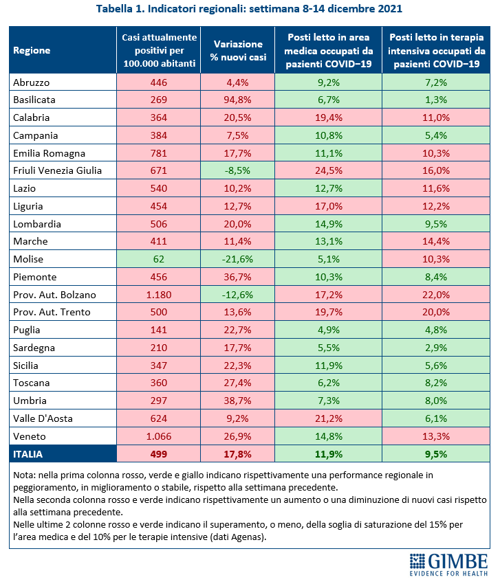 "Il nostro Paese – conclude Cartabellotta – è entrato in una fase critica della pandemia per la convergenza di vari fattori: la stagione invernale, gli oltre 6 milioni di non vaccinati, il netto ritardo iniziale nella somministrazione delle terze dosi, le imminenti festività natalizie che aumenteranno contatti sociali e contagi e, soprattutto, la progressiva diffusione della variante omicron che secondo l’Ecdc diventerà prevalente in Europa entro i primi due mesi del 2022. In questo contesto, le ultime misure del Governo, che mirano ad innalzare la protezione nei confronti del virus, non hanno modificato i criteri per assegnare i colori alle Regioni, definiti quando non erano noti il declino dell’efficacia vaccinale e la necessità delle terze dosi e non incombeva la minaccia di una variante così preoccupante. Criteri che lasciano alle Regioni la massima autonomia nell’aumentare la disponibilità di posti letto per ridurre i tassi di occupazione, con il rischio di congestionare silenziosamente gli ospedali e limitare l’accesso alle cure ai pazienti non Covid".