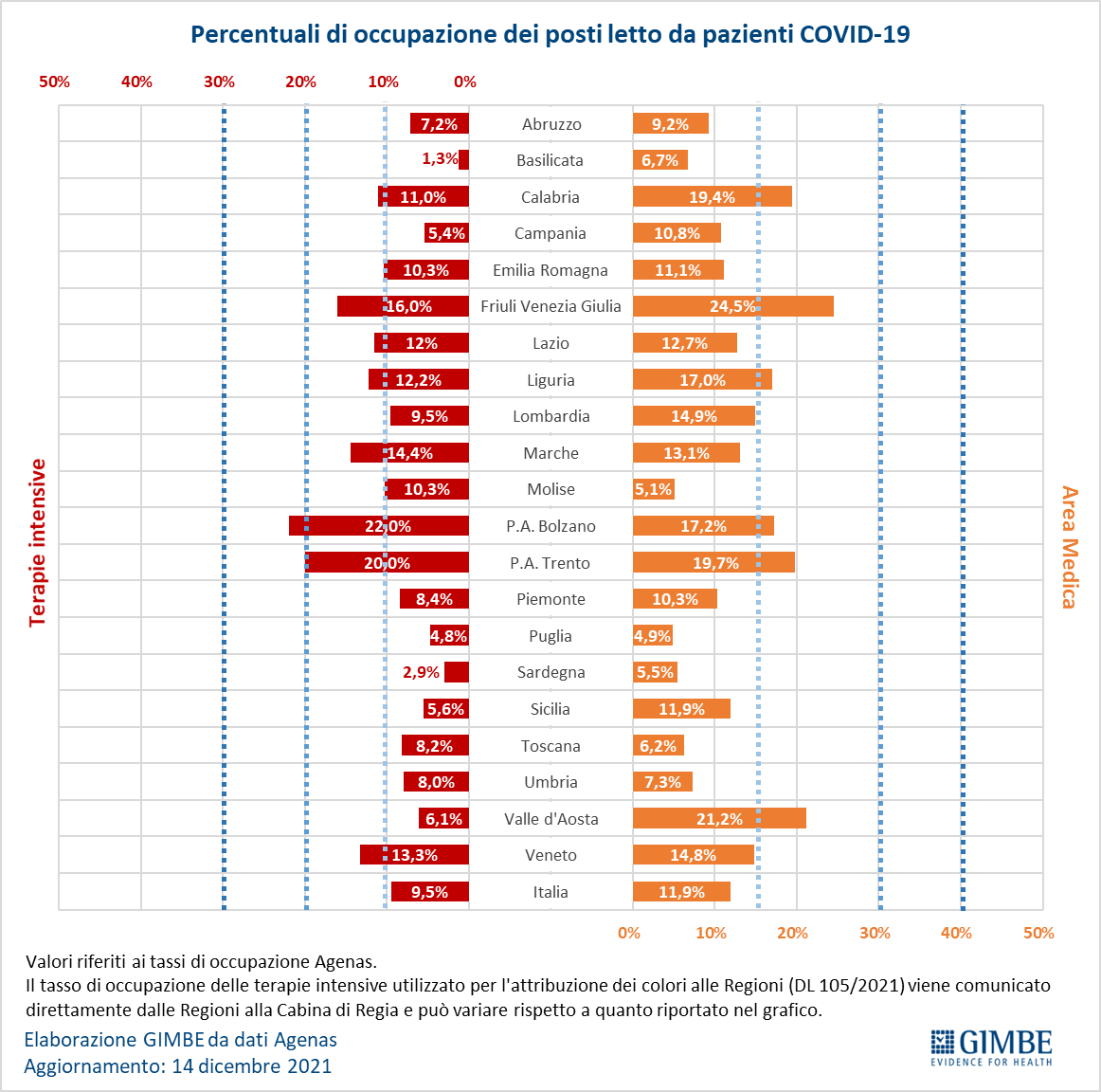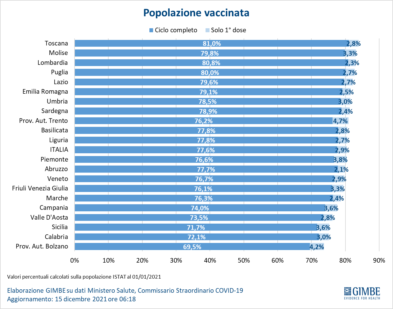 "Sul fronte ospedaliero – afferma Renata Gili, responsabile Ricerca sui Servizi Sanitari della Fondazione Gimbe – aumentano ancora i posti letto occupati da pazienti Covid: +17,9% in area medica e +11,2% in terapia intensiva rispetto alla settimana precedente". A livello nazionale, al 14 dicembre, il tasso di occupazione da parte di pazienti Covid è dell’11,9% in area medica e del 9,5% in area critica, con notevoli differenze regionali: la Provincia Autonoma di Bolzano supera la soglia del 15% in area medica (17,2%) e del 20% in area critica (22%); le soglie del 15% per l’area medica e del 10% per l’area critica risultano entrambe superate in Calabria (19,4% area medica e 11,0% area critica), Friuli-Venezia Giulia (24,5% area medica e 16,0% area critica), Liguria (17,0% area medica e 12,2% area critica) e Provincia Autonoma di Trento (19,7% area medica e 20,0% area critica).