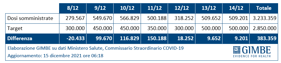 I target definiti dalla struttura commissariale nel periodo 8-14 dicembre sono stati sempre superati, fatta eccezione per l’8 dicembre: complessivamente sono state somministrate 383.359 dosi in più rispetto alle 2.850.000 previste.