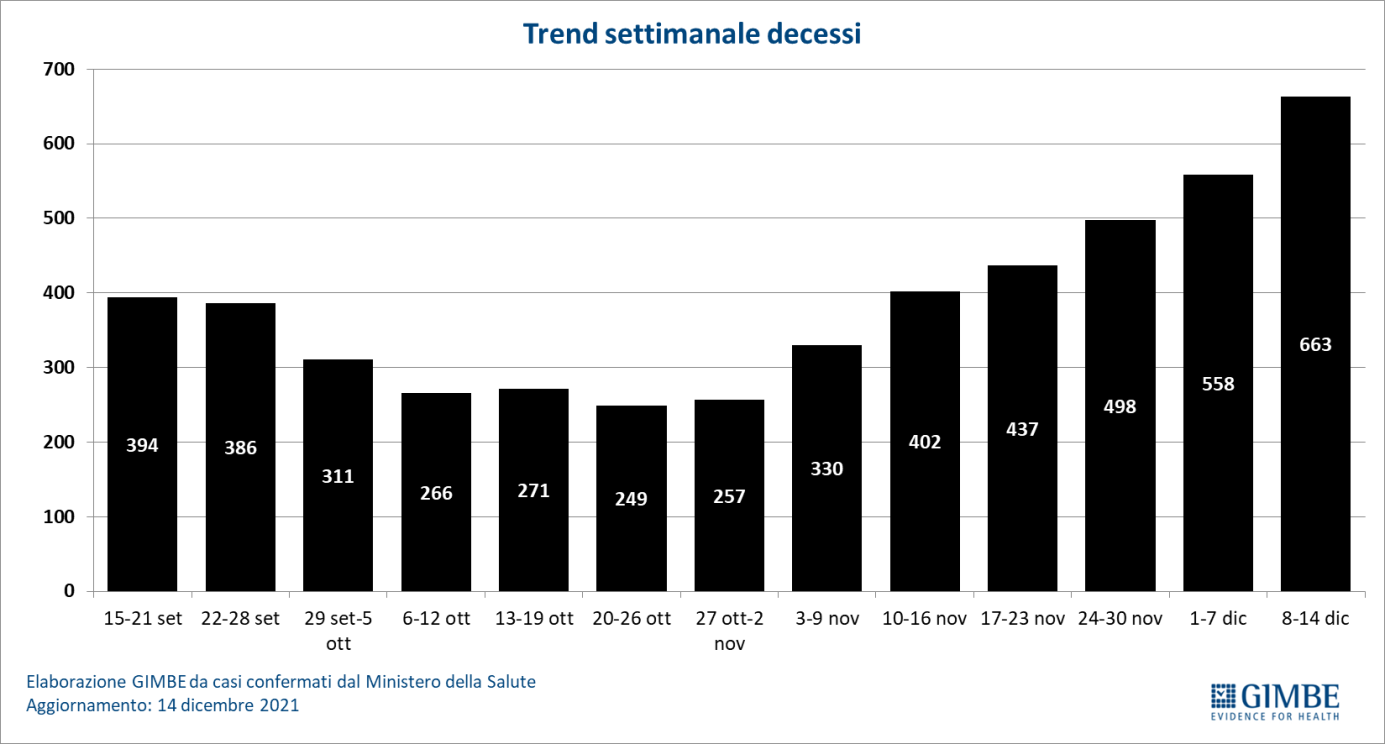 Il monitoraggio indipendente della Fondazione Gimbe rileva nella settimana 8-14 dicembre 2021, rispetto alla precedente, un aumento di nuovi casi (124.568 vs 105.771) (figura 1) e decessi (663 vs 558) (figura 2).