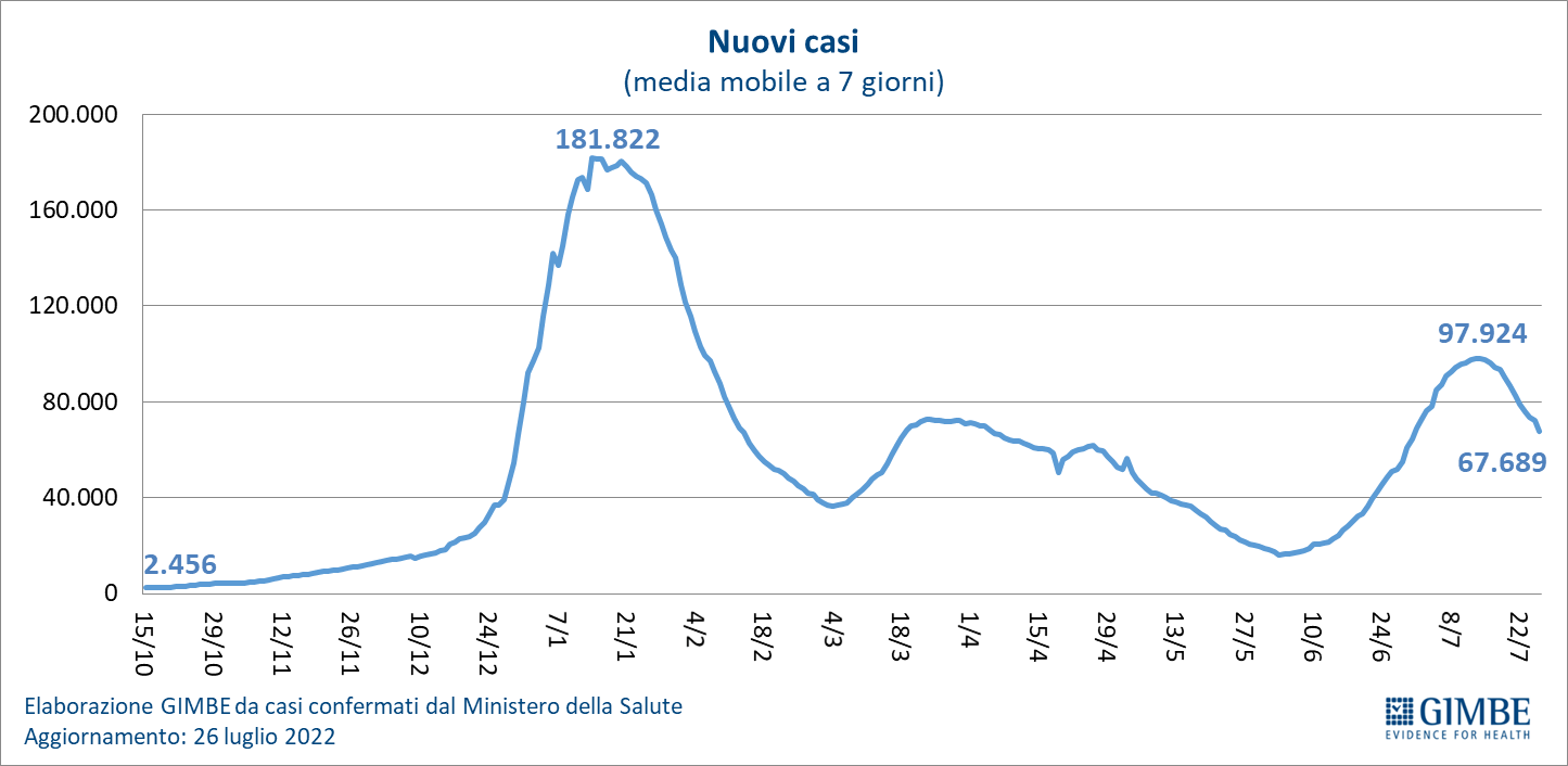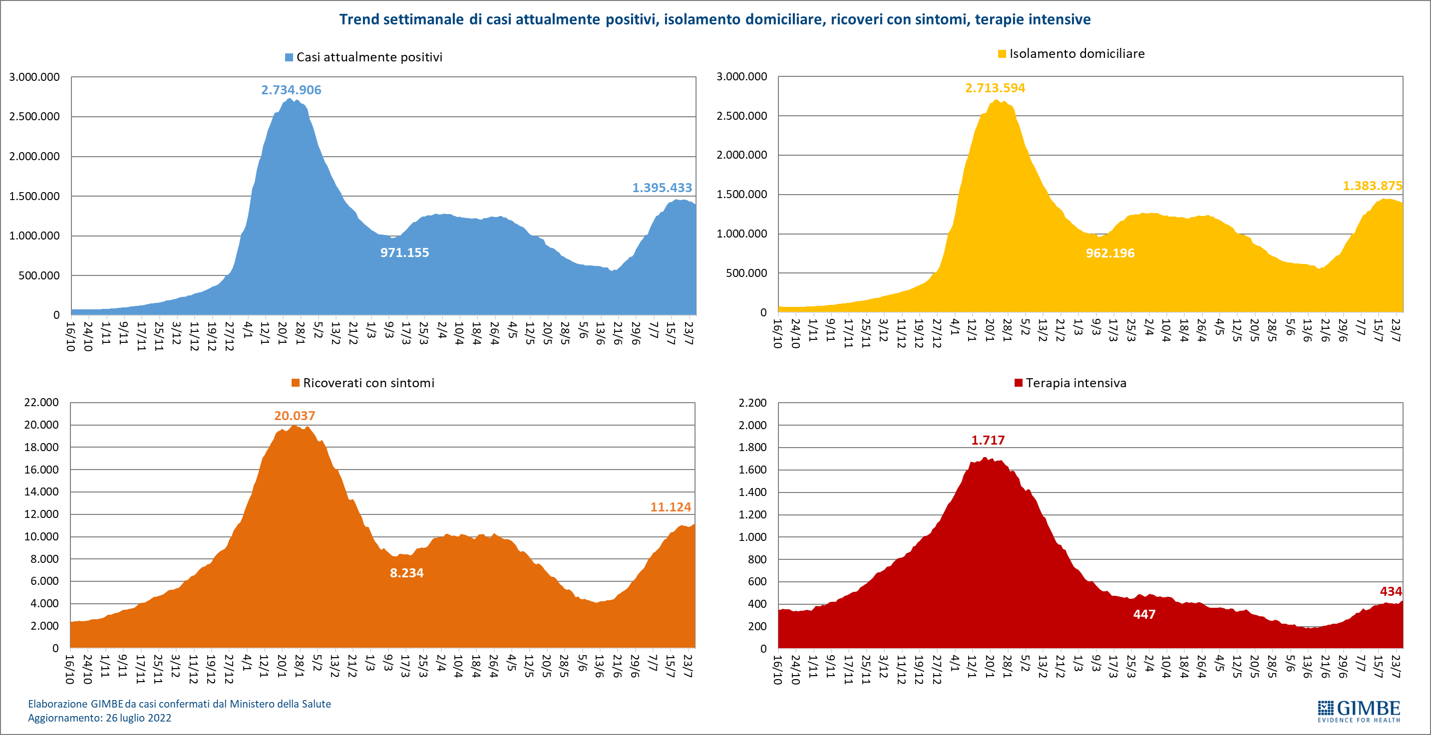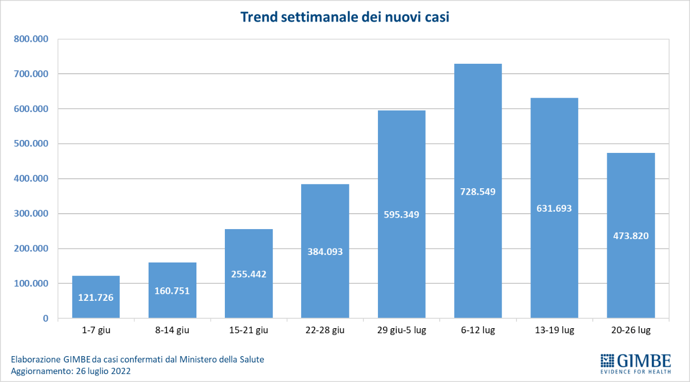 Il monitoraggio indipendente della Fondazione GIMBE rileva nella settimana 20-26 luglio 2022, rispetto alla precedente, una diminuzione di nuovi casi (473.820 vs 631.693), a fronte di un aumento dei decessi (1.019 vs 823). In calo i casi attualmente positivi (1.395.433 vs 1.452.941) e le persone in isolamento domiciliare (1.383.875 vs 1.441.553); ancora in crescita i ricoveri con sintomi (11.124 vs 10.975) e le terapie intensive (434 vs 413). In dettaglio, rispetto alla settimana precedente, si registrano le seguenti variazioni: