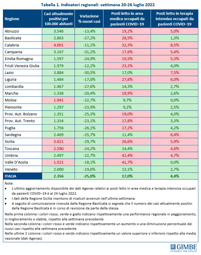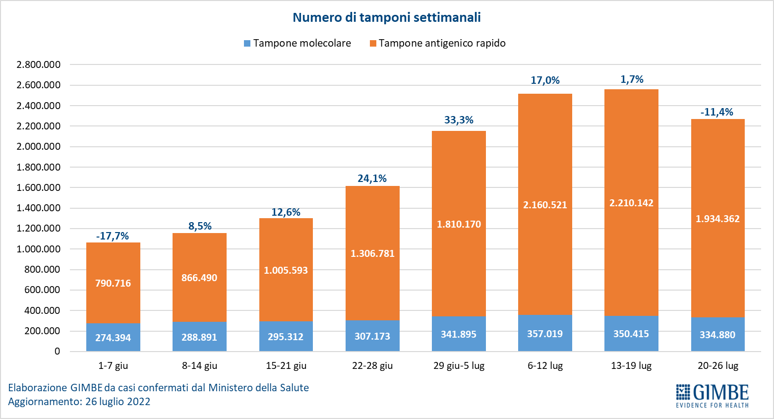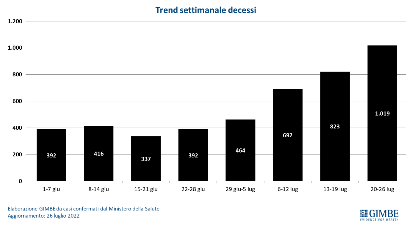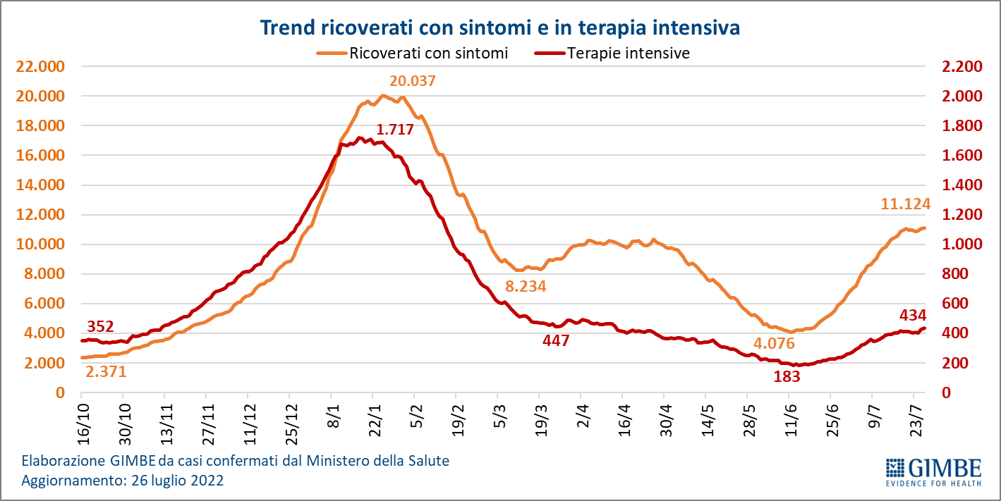 Il monitoraggio indipendente della Fondazione GIMBE rileva nella settimana 20-26 luglio 2022, rispetto alla precedente, una diminuzione di nuovi casi (473.820 vs 631.693), a fronte di un aumento dei decessi (1.019 vs 823). In calo i casi attualmente positivi (1.395.433 vs 1.452.941) e le persone in isolamento domiciliare (1.383.875 vs 1.441.553); ancora in crescita i ricoveri con sintomi (11.124 vs 10.975) e le terapie intensive (434 vs 413). In dettaglio, rispetto alla settimana precedente, si registrano le seguenti variazioni: