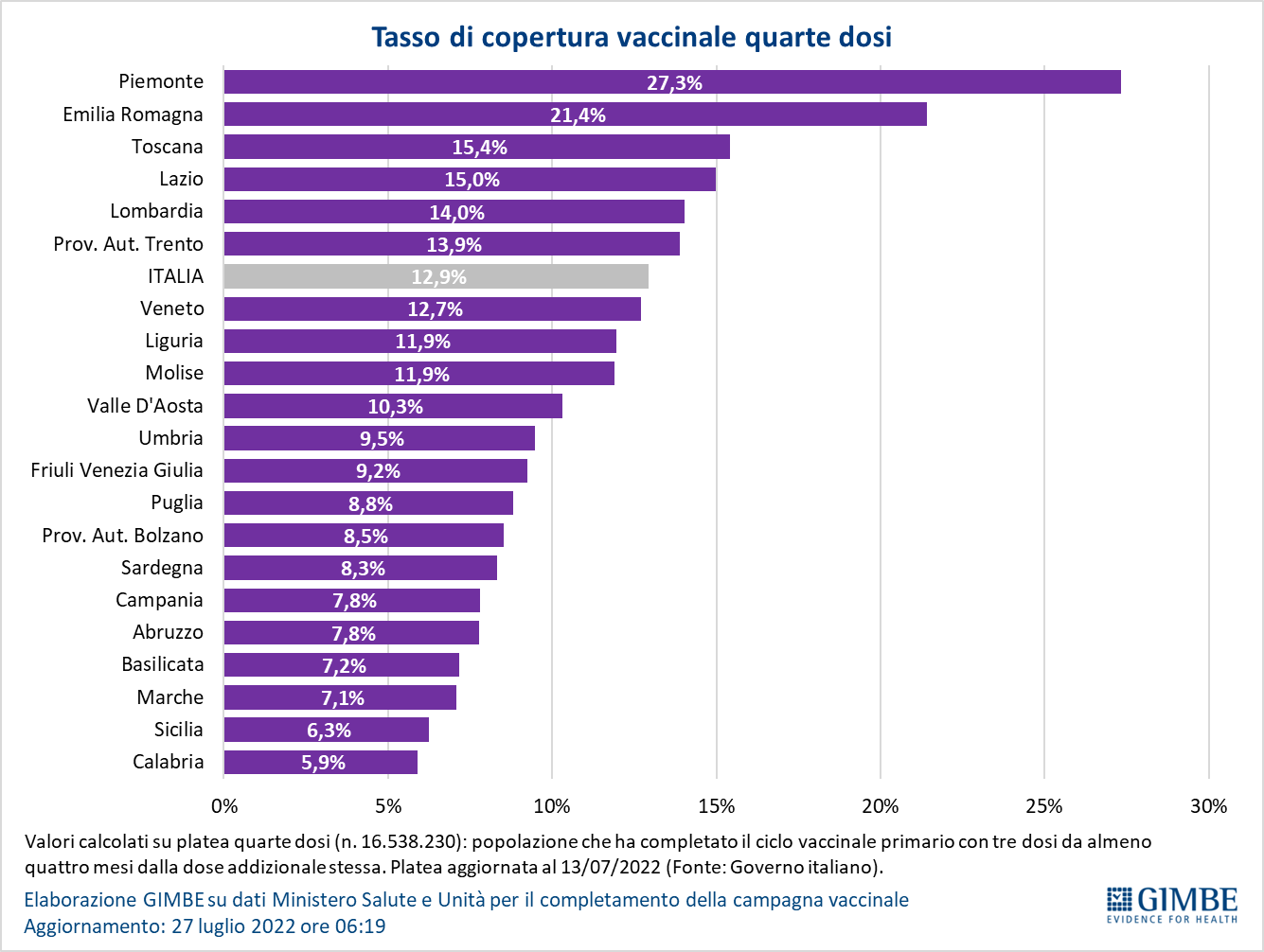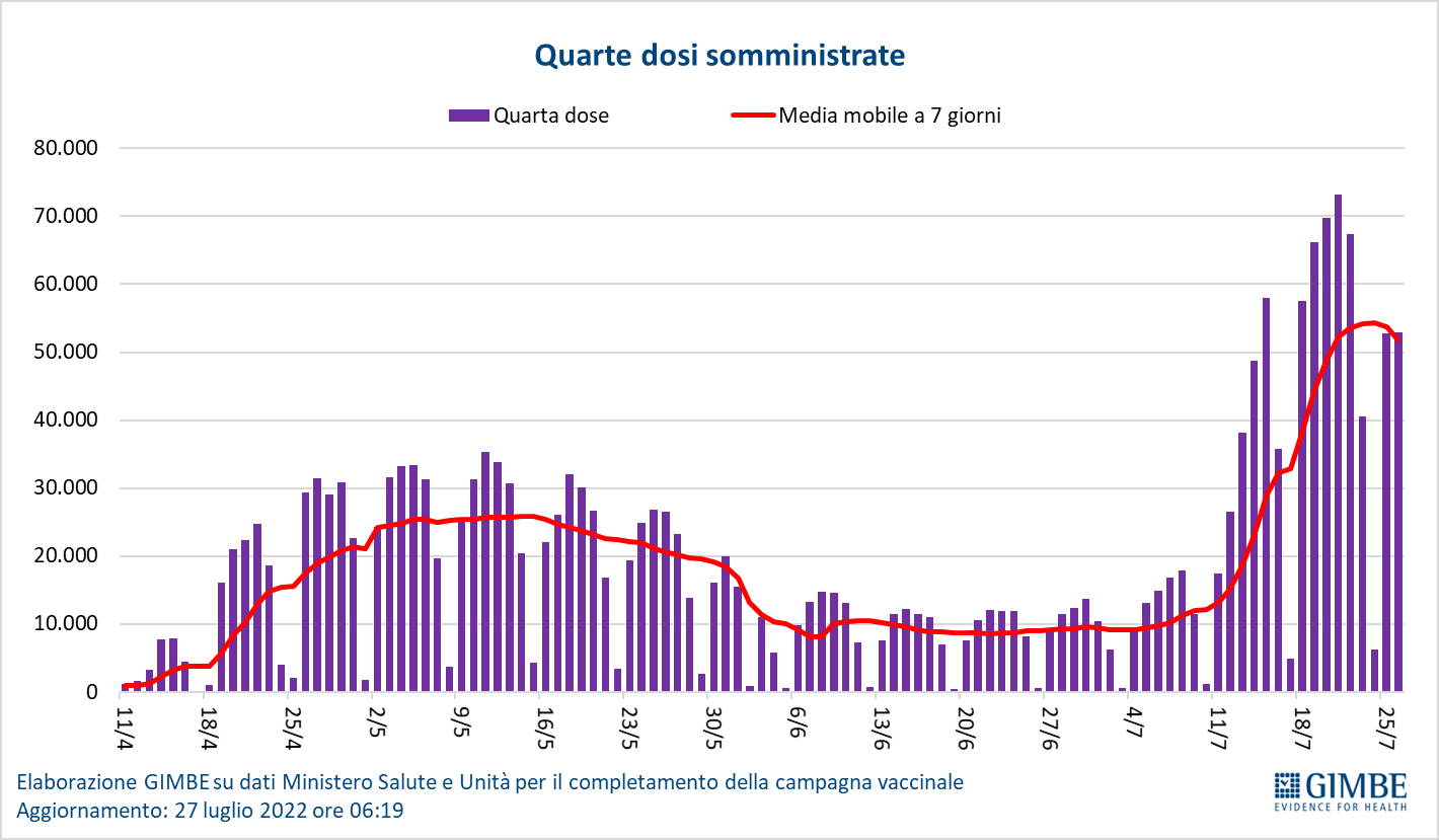 Al 27 luglio (aggiornamento ore 06.19) sono state somministrate 2.139.397 quarte dosi, con una media mobile di 51.815 somministrazioni al giorno, in lieve aumento rispetto alle 44.169 della scorsa settimana (+17,3%), ma la campagna non decolla e rimane ancora molto lontano il target di 100 mila somministrazioni fissato dalle linee di indirizzo dell’Unità per il completamento della campagna vaccinale. In base alla platea ufficiale (n. 16.538.230 di cui 6.148.340 della fascia 60-69 anni, 5.053.186 della fascia 70-79 anni, 2.918.641 di over 80, 2.329.964 di pazienti fragili e persone immunocompromesse e 88.099 di ospiti delle RSA che non ricadono nelle categorie precedenti), aggiornata al 13 luglio, il tasso di copertura nazionale per le quarte dosi è del 12,9% con nette differenze regionali: dal 5,9% della Calabria al 27,3% del Piemonte.