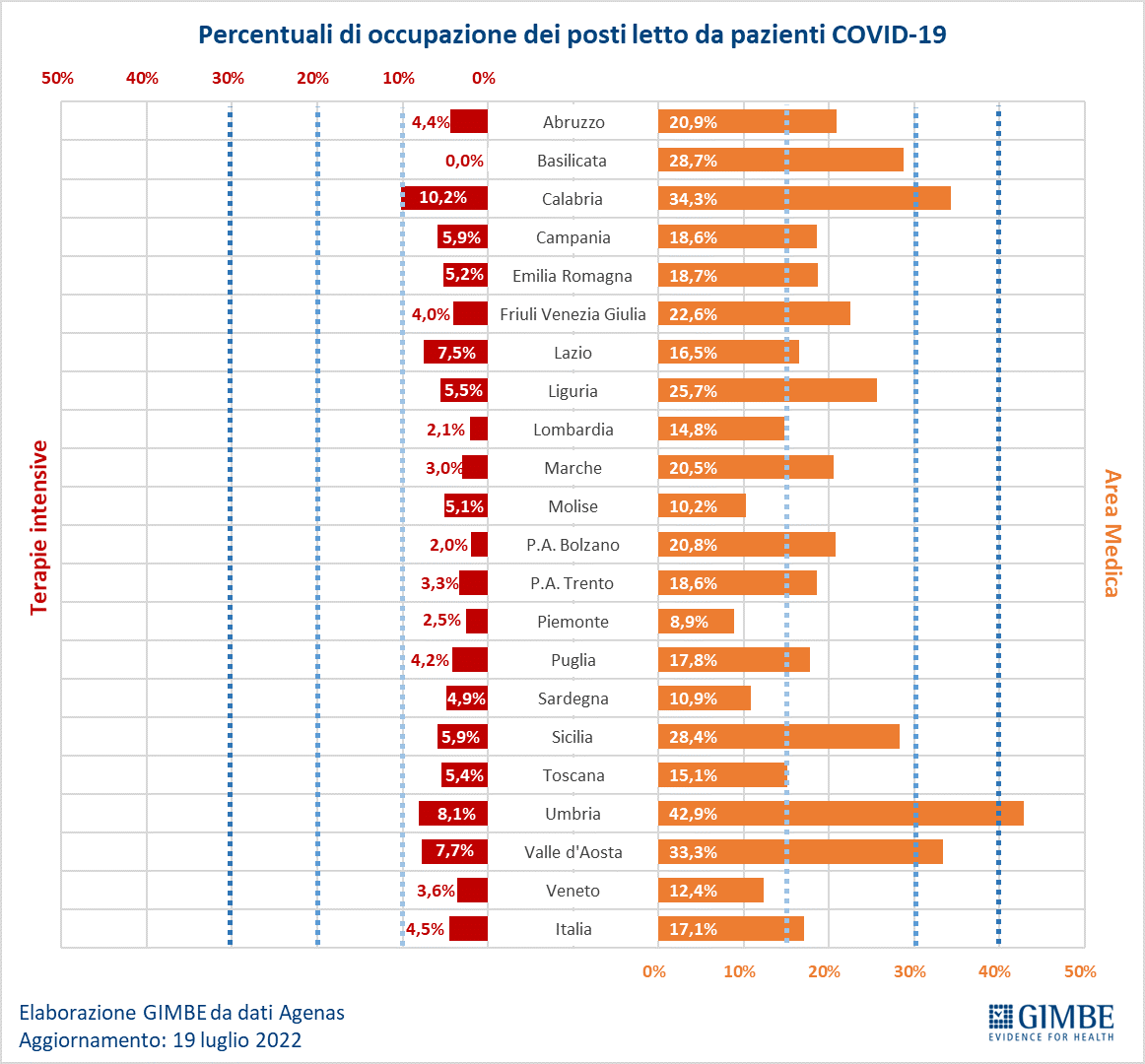 Ospedalizzazioni. “Sul fronte degli ospedali – afferma Marco Mosti, Direttore Operativo della Fondazione GIMBE – frena l’aumento dei ricoveri sia in area medica (+1,4%) che in terapia intensiva (+5,1%)». Complessivamente in sei settimane i ricoveri sono più che raddoppiati in area critica (da 183 il 12 giugno a 434 il 26 luglio) e quasi triplicati in area medica (da 4.076 il 11 giugno a 11.124 il 26 luglio) (figura 7). Al 24 luglio, ultimo aggiornamento disponibile sul sito Agenas, il tasso nazionale di occupazione da parte di pazienti COVID è del 17% in area medica (dal 9,2% del Piemonte al 42,4% dell’Umbria) e del 4,4% in area critica (dallo 0% di Molise e Valle D’Aosta all’8,5% della Calabria) (figura 8). “In lieve riduzione gli ingressi in terapia intensiva – puntualizza Mosti – con una media mobile a 7 giorni di 44 ingressi/die rispetto ai 49 della settimana precedente”.