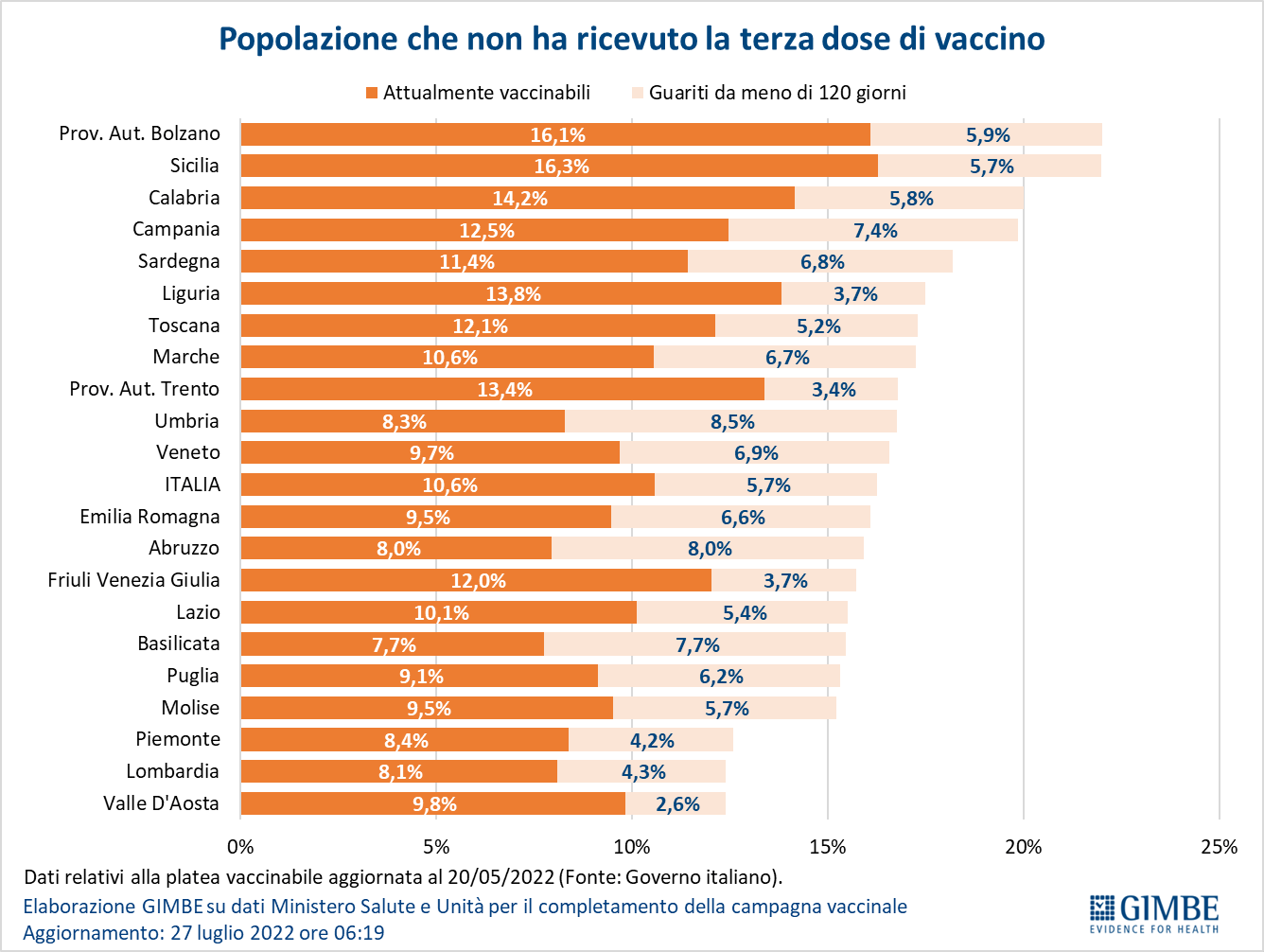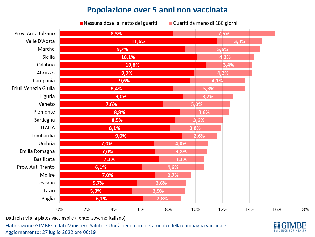 - 2,71 milioni non possono riceverla nell’immediato in quanto guarite da meno di 120 giorni, pari al 5,7% della platea con nette differenze regionali (dal 2,6% della Valle D’Aosta all’8,5% dell’Umbria).