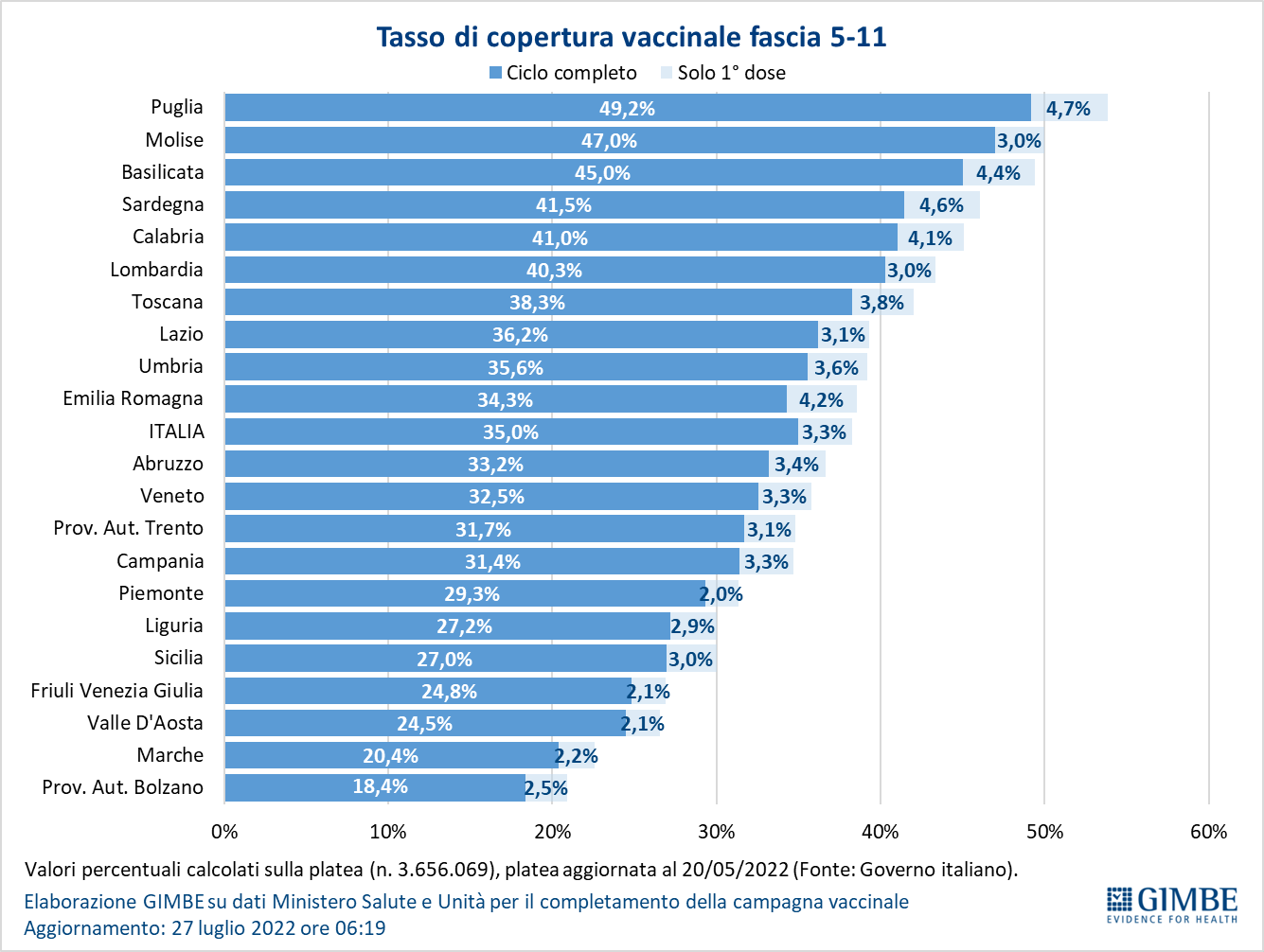 Vaccini: fascia 5-11 anni. Al 27 luglio (aggiornamento ore 06.19) nella fascia 5-11 anni sono state somministrate 2.590.471 dosi: 1.399.530 hanno ricevuto almeno 1 dose di vaccino (di cui 1.278.745 hanno completato il ciclo vaccinale), con un tasso di copertura nazionale al 38,3% con nette differenze regionali: dal 20,9% della Provincia Autonoma di Bolzano al 53,8% della Puglia.