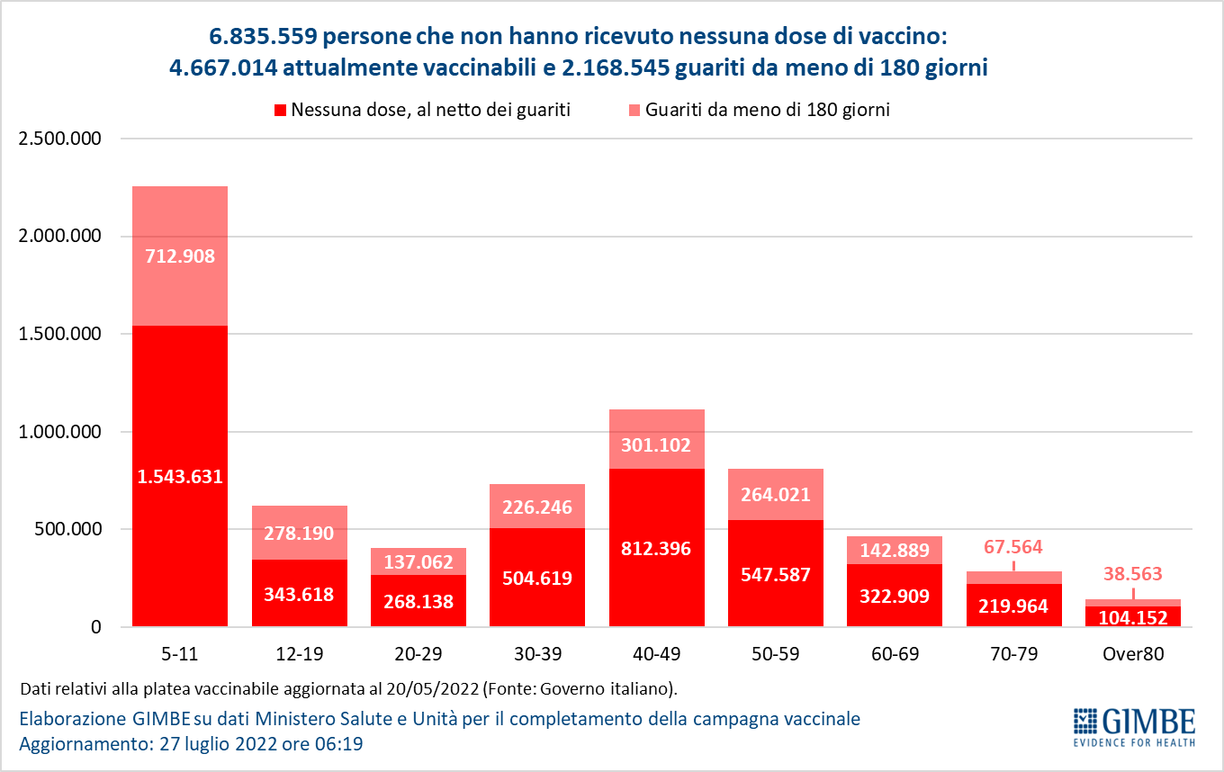 Vaccini: persone non vaccinate. Al 27 luglio (aggiornamento ore 06.19) sono 6,84 milioni le persone di età superiore a 5 anni che non hanno ricevuto nemmeno una dose di vaccino, di cui: