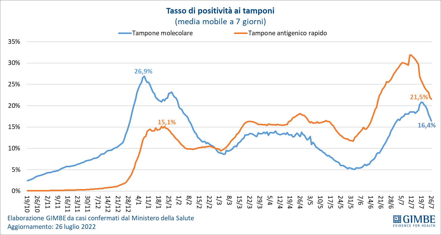 Testing. Si registra un calo del numero dei tamponi totali (-11,4%): da 2.560.557 della settimana 13-19 luglio a 2.269.242 della settimana 20-26 luglio. In particolare, i tamponi rapidi sono diminuiti del 12,5% (-275.780), e quelli molecolari del 4,4% (-15.535) (figura 5). La media mobile a 7 giorni del tasso di positività si riduce dal 20,8% al 16,4% per i tamponi molecolari e dal 25,9% al 21,5% per gli antigenici rapidi.